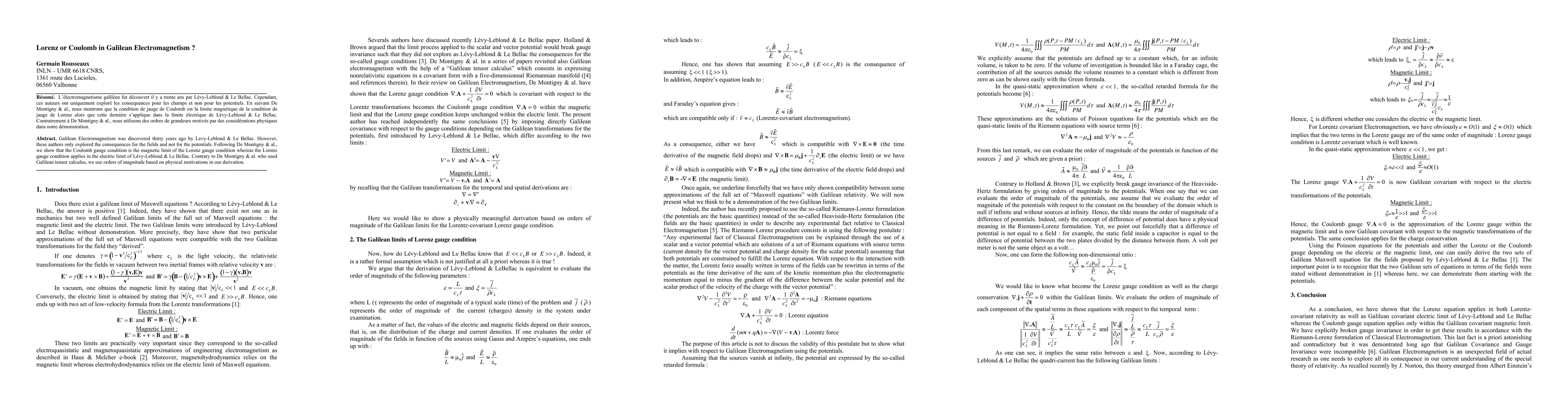 Galilean Electromagnetism was discovered thirty years ago by Levy-Leblond & Le Bellac. However, these authors only explored the consequences for the fields and not for the potentials. Following De Montigny & al., we show that the Coulomb gauge condition is the magnetic limit of the Lorenz gauge condition whereas the Lorenz gauge condition applies in the electric limit of L\'{e}vy-Leblond & Le Bellac. Contrary to De Montigny & al. who used Galilean tensor calculus, we use orders of magnitude based on physical motivations in our derivation.
