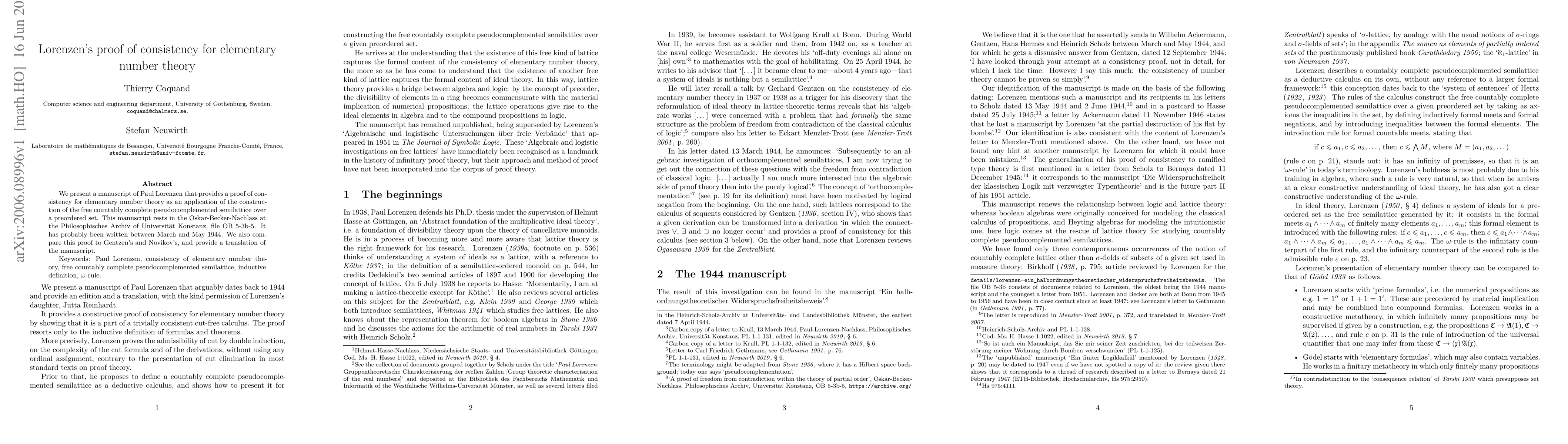 Summary: Paul Lorenzen's manuscript offers a proof of consistency for elementary number theory using a free countably complete pseudocomplemented semilattice. This work, likely written in 1944, is compared to Gentzen's and Novikov's proofs, and includes a translation of the original document.
