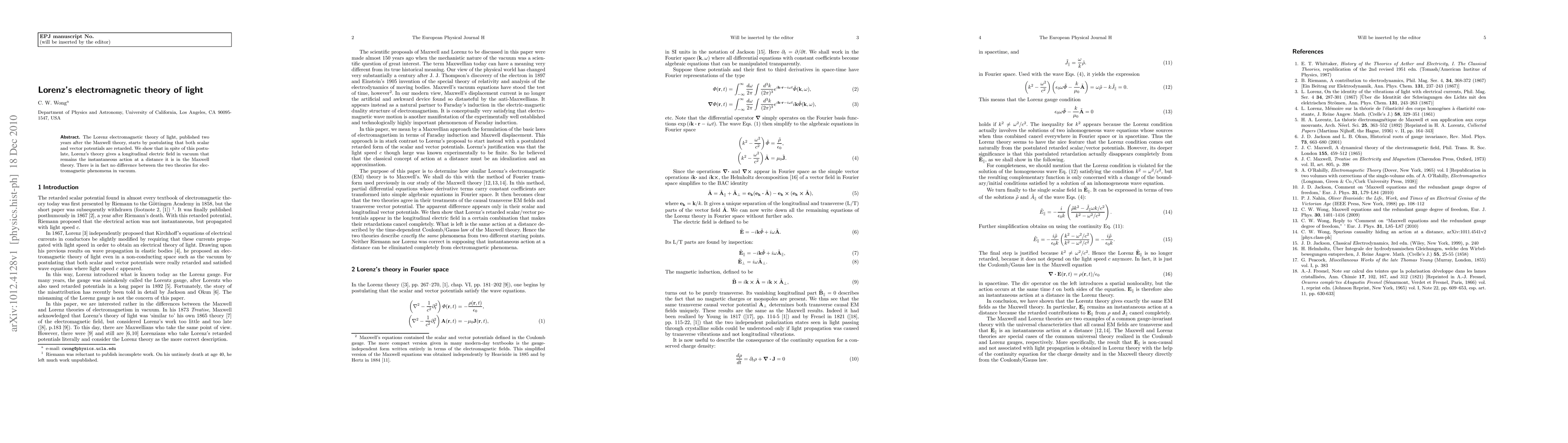 The Lorenz electromagnetic theory of light, published two years after the Maxwell theory, starts by postulating that both scalar and vector potentials are retarded. We show that in spite of this postulate, Lorenz's theory gives a longitudinal electric field in vacuum that remains the instantaneous action at a distance it is in the Maxwell theory. There is in fact no difference between the two theories for electromagnetic phenomena in vacuum.