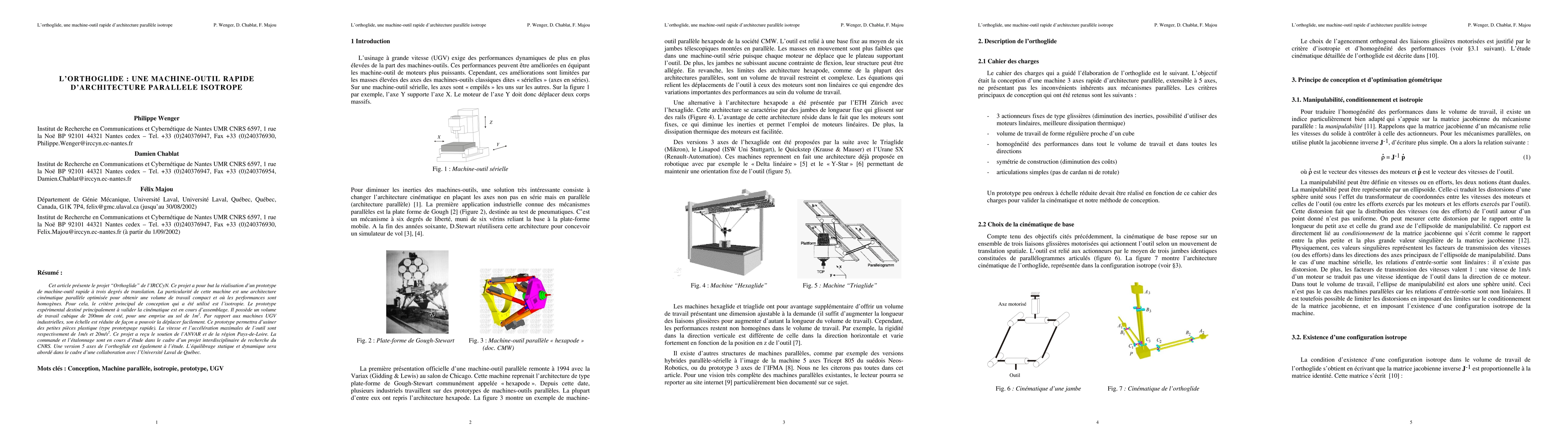 This article presents the Orthoglide project. The purpose of this project is the realization of a prototype of machine tool to three degrees of translation. The characteristic of this machine is a parallel kinematic architecture optimized to obtain a compact workspace with homogeneous performance. For that, the principal criterion of design which was used is the isotropy.