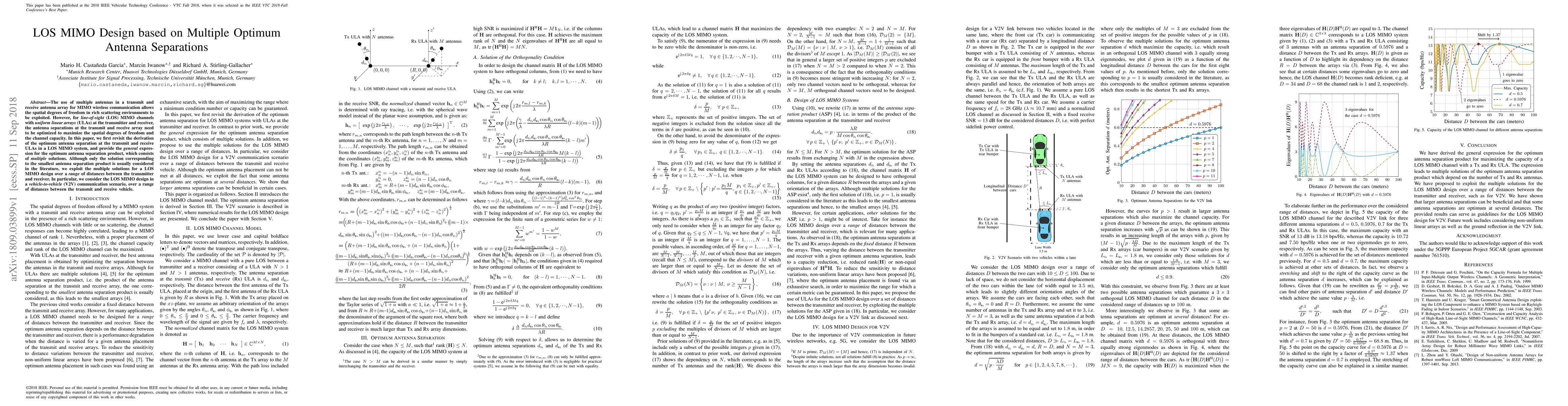 This paper explores optimal antenna separations in LOS MIMO systems using uniform linear arrays, deriving general expressions for multiple optimum antenna separations to maximize spatial degrees of freedom and channel capacity. It applies these findings to vehicle-to-vehicle communication scenarios over varying distances.