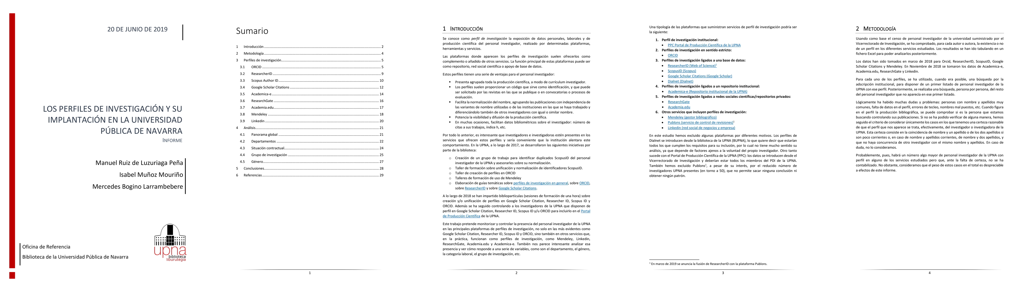 This work aims to monitor and control the presence of UPNA research staff in the main research profiles platforms, not only in the most obvious ones such as Google Scholar Citation, Researcher ID, Scopus ID and ORCID, but also in other services that, in practice, they function as research profiles, such as Mendeley, Linkedin, ResearchGate, Academia.edu and Academica-e. We also find it interesting to analyze that presence and see how it responds to a variables, such as the department, gender, job category, research group. In this study we have excluded some platforms for different reasons. Dialnet profiles are entered from the UPNA library (BUPNA), which means that all those who meet the requirements for inclusion would be there, so their analysis does not make much sense, since it depends on factors outside the will of the researcher himself. The same is the case with the UPNA Scientific Production Portal (PPC): the data is entered from the Vicerrectorado de Investigaci\'on and should include all members of the UPNA PDI. Using as a base the census of university research staff provided by the Vicerrectorado de Investigaci\'on, it has been verified, for each author, the existence or not of a profile in the different services studied. The results have been tabulated in an Excel file to be able to analyze them later. The data has been collected in March 2018 for Orcid, ResearcherID, ScopusID, Google Scholar Citations and Mendeley. In November 2018, data from Academica-e, Academia.edu, ResearchGate and Linkedin were taken. For each of the profiles, a search by institutional affiliation was used, when possible, to obtain a first list of UPNA research personnel with that profile. Subsequently, a search was carried out, person by person, of the rest of the research staff that did not appear in that first list.