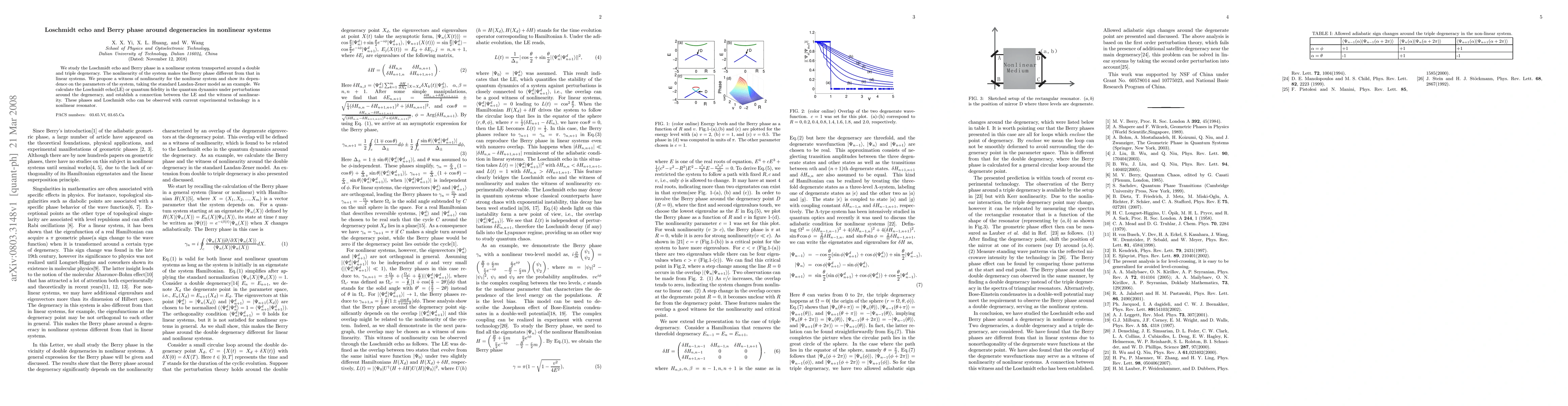 This paper investigates the Loschmidt echo and Berry phase in nonlinear systems around double and triple degeneracies, revealing differences from linear systems. It proposes a nonlinearity witness and demonstrates its dependence on system parameters, using the Landau-Zener model as an example, and connects the Loschmidt echo to this witness, suggesting observable implications in nonlinear resonators.