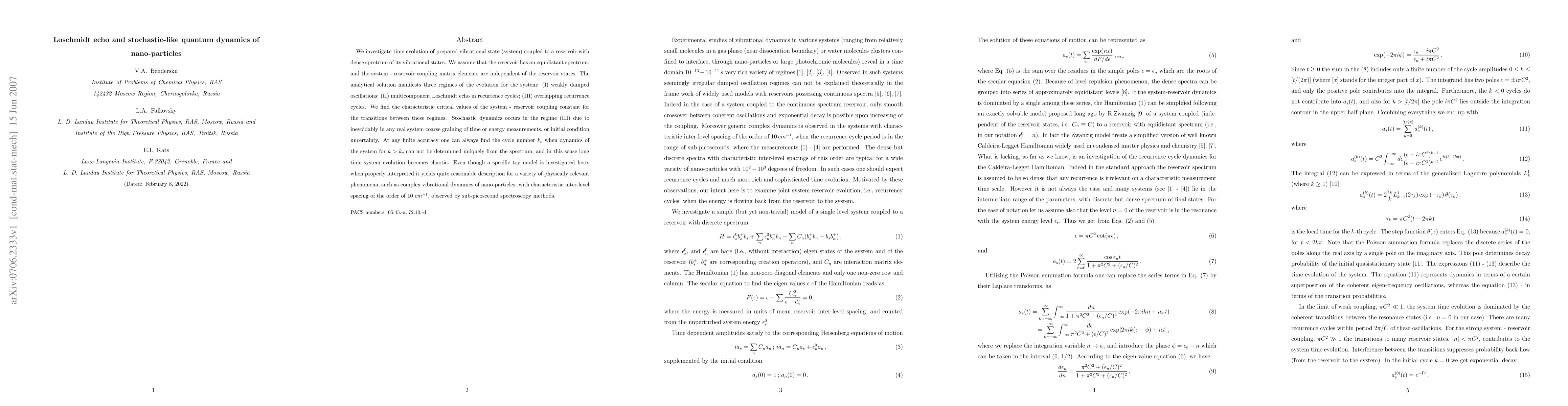 We investigate time evolution of prepared vibrational state (system) coupled to a reservoir with dense spectrum of its vibrational states. We assume that the reservoir has an equidistant spectrum, and the system - reservoir coupling matrix elements are independent of the reservoir states. The analytical solution manifests three regimes of the evolution for the system: (I) weakly damped oscillations; (II) multicomponent Loschmidt echo in recurrence cycles; (III) overlapping recurrence cycles. We find the characteristic critical values of the system - reservoir coupling constant for the transitions between these regimes. Stochastic dynamics occurs in the regime (III) due to inevoidably in any real system coarse graining of time or energy measurements, or initial condition uncertainty. Even though a specific toy model is investigated here, when properly interpreted it yields quite reasonable description for a variety of physically relevant phenomena.