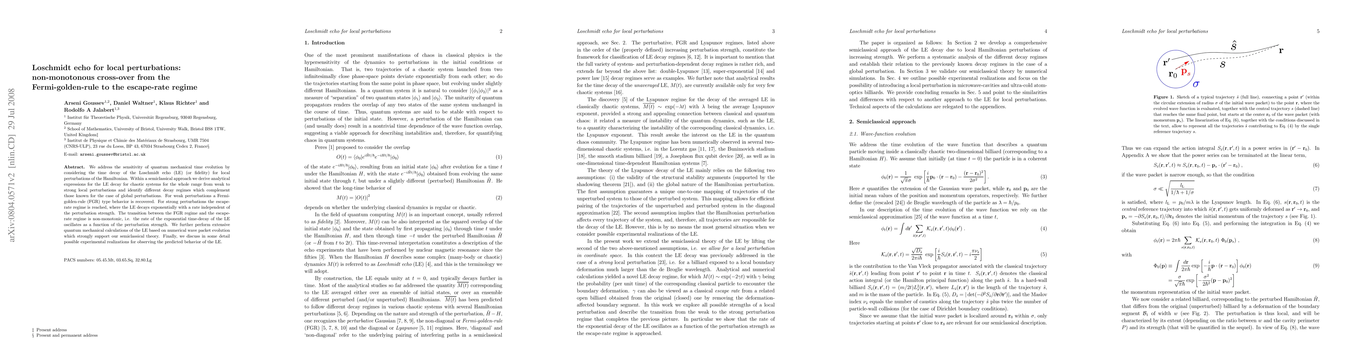 This paper investigates the time decay of the Loschmidt echo for local Hamiltonian perturbations in quantum systems, identifying different decay regimes. It finds a non-monotonic transition between Fermi-golden-rule and escape-rate regimes, supported by both semiclassical theory and quantum mechanical calculations.