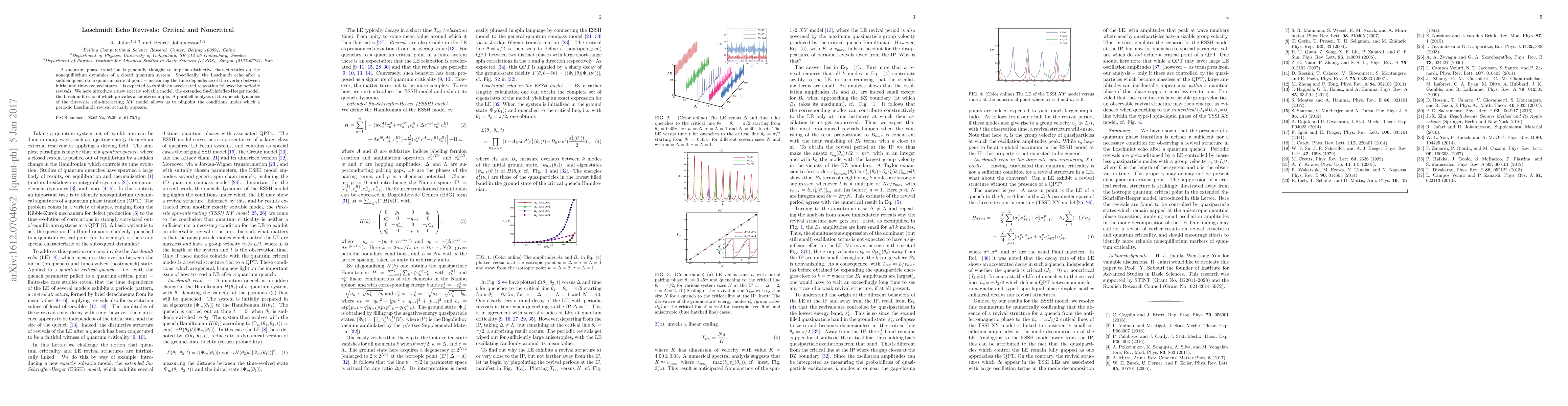 This paper investigates the Loschmidt echo dynamics in quantum phase transitions, revealing that the extended Su-Schrieffer-Heeger model does not follow the expected accelerated relaxation and periodic revivals. It also analyzes the three-site spin-interacting XY model to identify conditions under which periodic Loschmidt revivals occur.