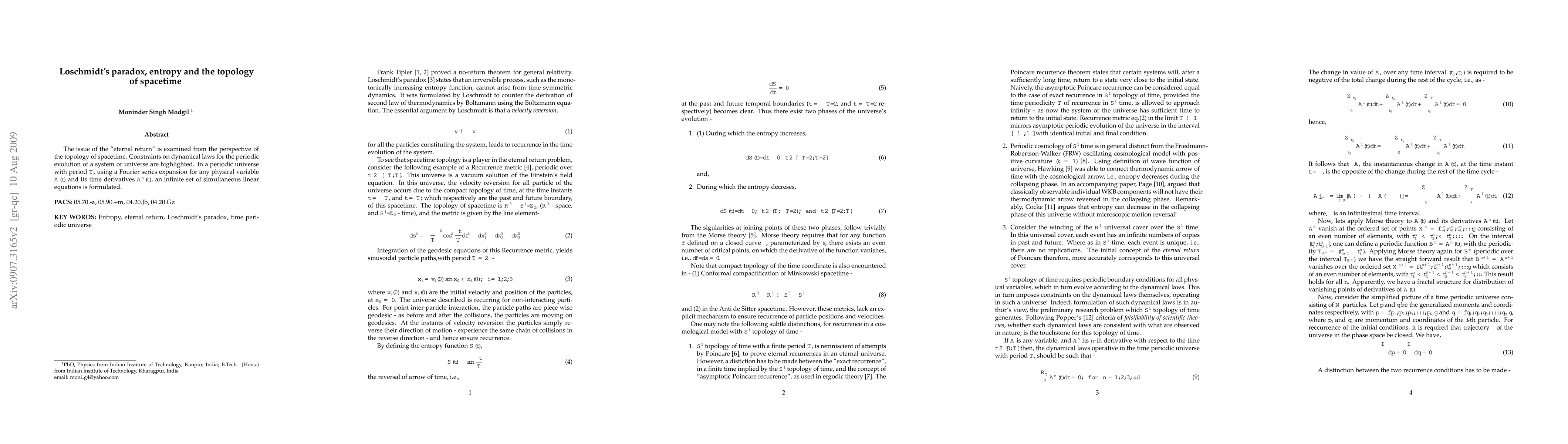 The issue of the "eternal return" is examined from the perspective of the topology of spacetime. Constraints on dynamical laws for the periodic evolution of a system or universe are highlighted. Using a Fourier series expansion, an infinite set of simultaneous linear equations is formulated for the periodic evolution of a system/universe.
