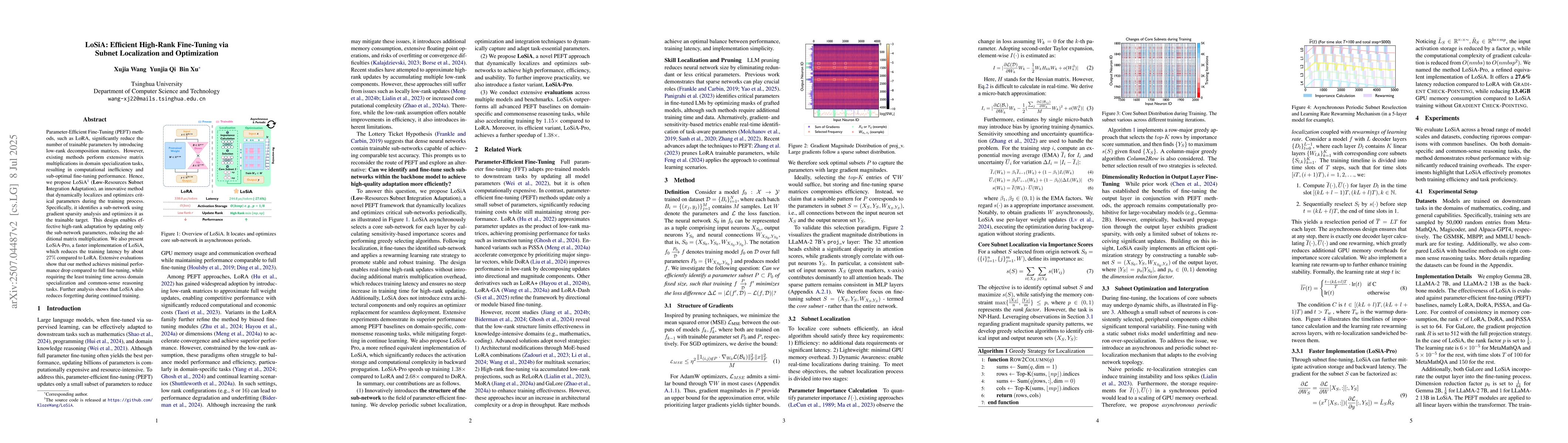 Parameter-Efficient Fine-Tuning (PEFT) methods, such as LoRA, significantly reduce the number of trainable parameters by introducing low-rank decomposition matrices. However, existing methods perform extensive matrix multiplications in domain specialization tasks, resulting in computational inefficiency and sub-optimal fine-tuning performance. Hence, we propose LoSiA(Low-Resources Subnet Integration Adaptation), an innovative method that dynamically localizes and optimizes critical parameters during the training process. Specifically, it identifies a sub-network using gradient sparsity analysis and optimizes it as the trainable target. This design enables effective high-rank adaptation by updating only the sub-network parameters, reducing the additional matrix multiplication. We also present LoSiA-Pro, a faster implementation of LoSiA, which reduces the training latency by about $27\%$ compared to LoRA. Extensive evaluations show that our method achieves minimal performance drop compared to full fine-tuning, while requiring the least training time across domain specialization and common-sense reasoning tasks. Further analysis shows that LoSiA also reduces forgetting during continued training.