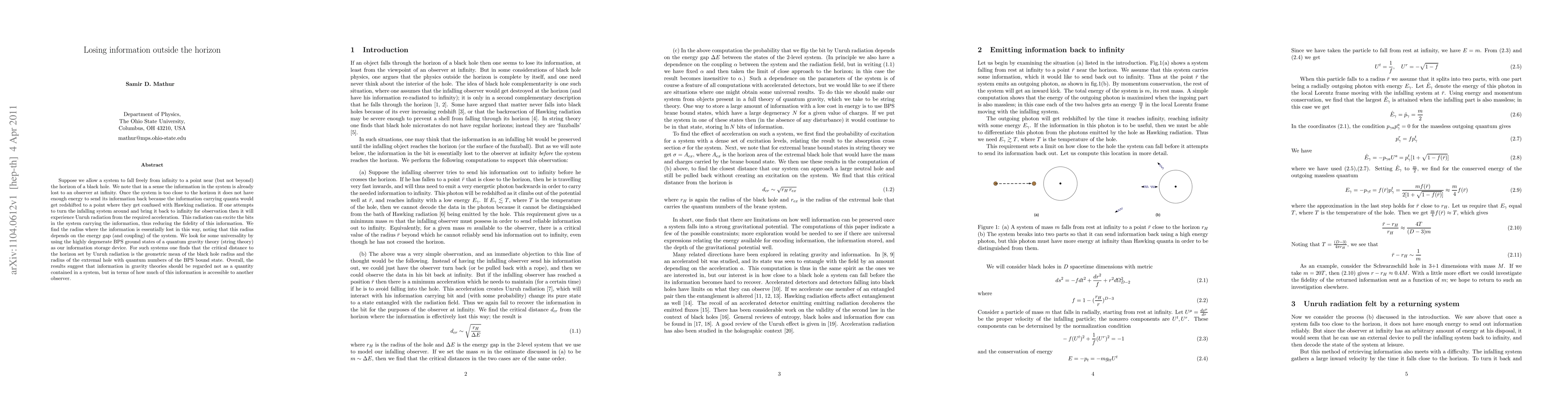 Suppose we allow a system to fall freely from infinity to a point near (but not beyond) the horizon of a black hole. We note that in a sense the information in the system is already lost to an observer at infinity. Once the system is too close to the horizon it does not have enough energy to send its information back because the information carrying quanta would get redshifted to a point where they get confused with Hawking radiation. If one attempts to turn the infalling system around and bring it back to infinity for observation then it will experience Unruh radiation from the required acceleration. This radiation can excite the bits in the system carrying the information, thus reducing the fidelity of this information. We find the radius where the information is essentially lost in this way, noting that this radius depends on the energy gap (and coupling) of the system. We look for some universality by using the highly degenerate BPS ground states of a quantum gravity theory (string theory) as our information storage device. For such systems one finds that the critical distance to the horizon set by Unruh radiation is the geometric mean of the black hole radius and the radius of the extremal hole with quantum numbers of the BPS bound state. Overall, the results suggest that information in gravity theories should be regarded not as a quantity contained in a system, but in terms of how much of this information is accessible to another observer.