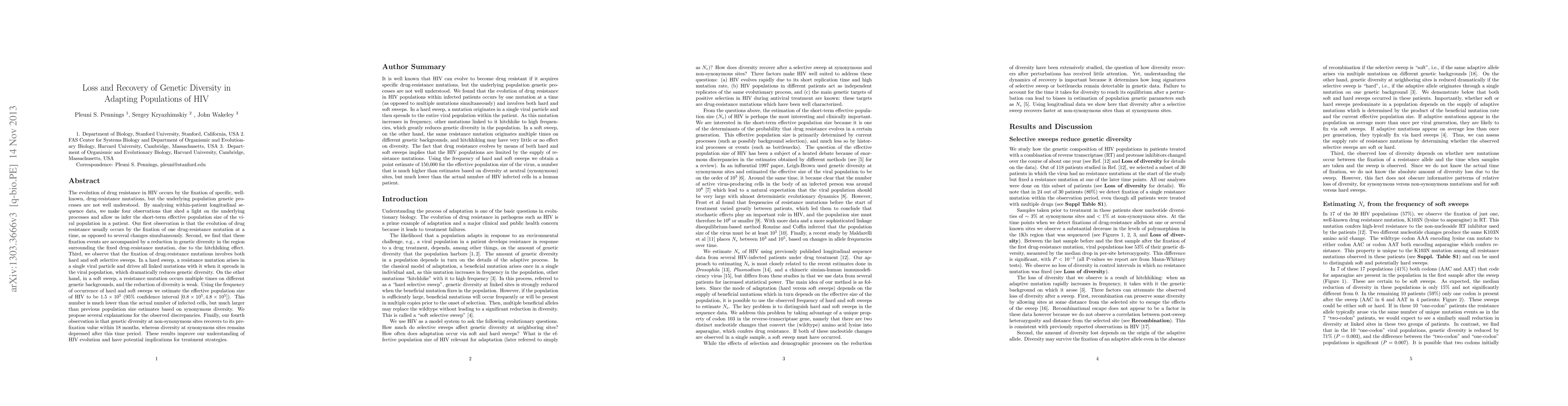 This study analyzes HIV drug resistance evolution, revealing that resistance typically arises through single mutation fixation, causing temporary genetic diversity reduction due to hitchhiking effects. The effective population size of HIV is estimated at 1.5 * 10^5, based on hard and soft selective sweeps, which is lower than the total number of infected cells but higher than previous estimates.