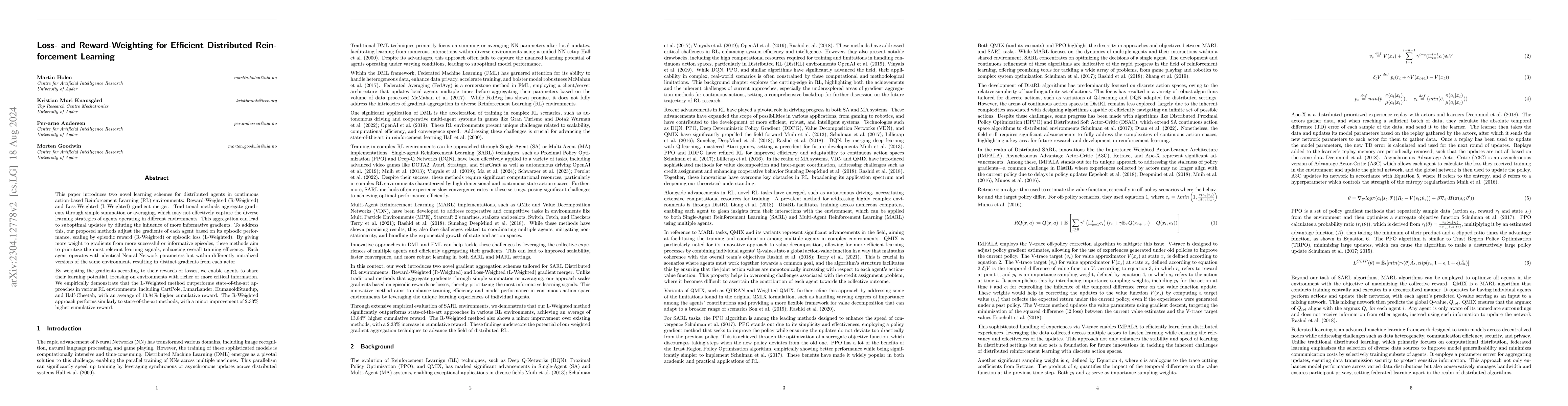 This paper proposes Reward-Weighted and Loss-Weighted gradient merger methods for distributed Reinforcement Learning, which scale each agent's gradient based on its reward or loss compared to others, prioritizing learning from more informative environments. Empirical results show superior performance of the Reward-Weighted method over current state-of-the-art approaches.