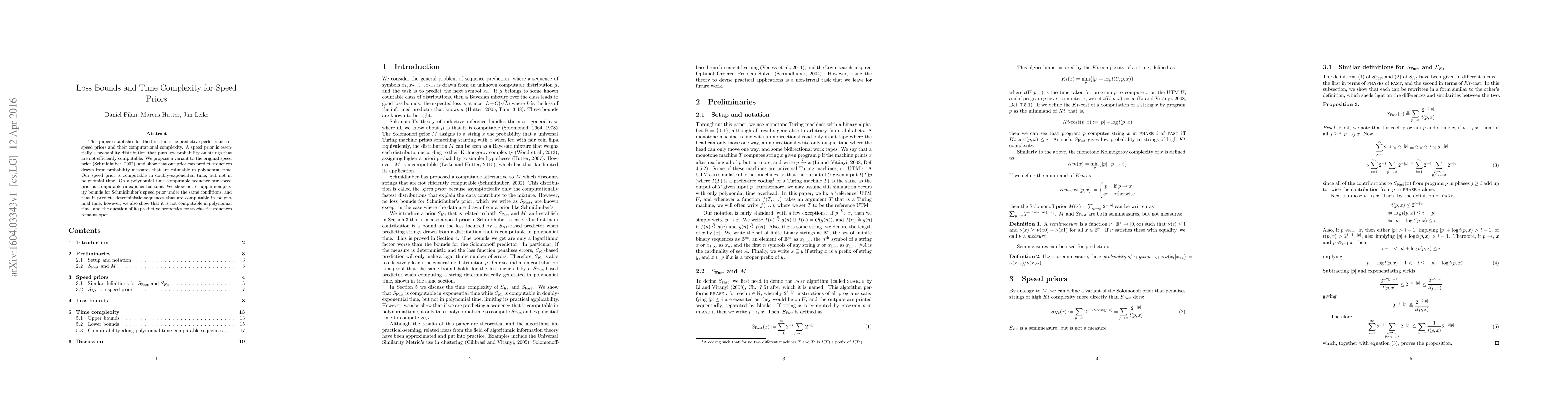 This paper establishes for the first time the predictive performance of speed priors and their computational complexity. A speed prior is essentially a probability distribution that puts low probability on strings that are not efficiently computable. We propose a variant to the original speed prior (Schmidhuber, 2002), and show that our prior can predict sequences drawn from probability measures that are estimable in polynomial time. Our speed prior is computable in doubly-exponential time, but not in polynomial time. On a polynomial time computable sequence our speed prior is computable in exponential time. We show better upper complexity bounds for Schmidhuber's speed prior under the same conditions, and that it predicts deterministic sequences that are computable in polynomial time; however, we also show that it is not computable in polynomial time, and the question of its predictive properties for stochastic sequences remains open.