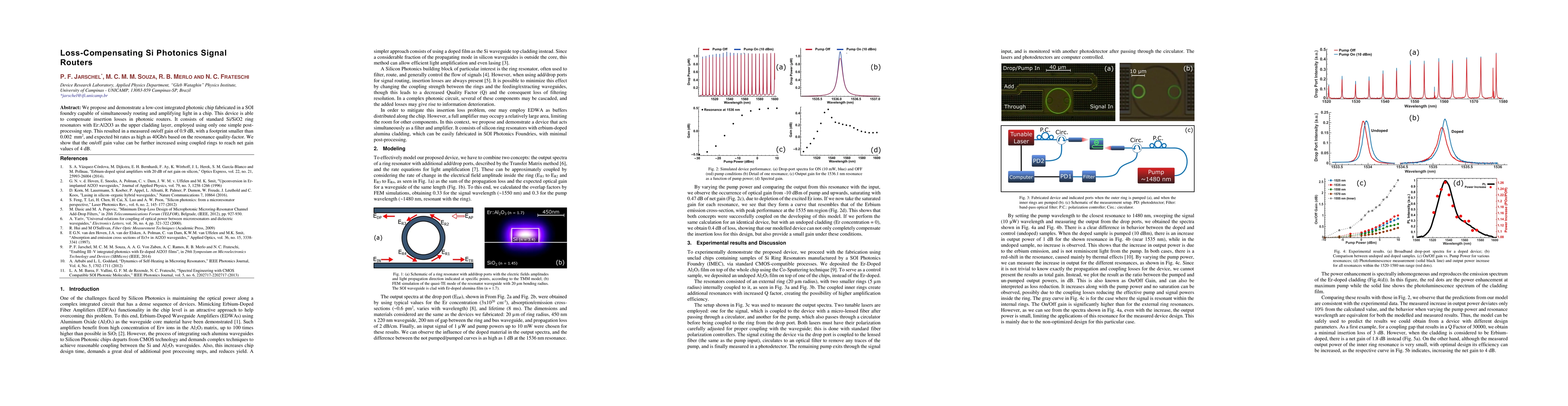 We propose and demonstrate a low-cost integrated photonic chip fabricated in a SOI foundry capable of simultaneously routing and amplifying light in a chip. This device is able to compensate insertion losses in photonic routers. It consists of standard Si/SiO2 ring resonators with Er:Al2O3 as the upper cladding layer, employed using only one simple post-processing step. This resulted in a measured on/off gain of 0.9 dB, with a footprint smaller than 0.002 mm2, and expected bit rates as high as 40Gb/s based on the resonance quality-factor. We show that the on/off gain value can be further increased using coupled rings to reach net gain values of 4 dB.