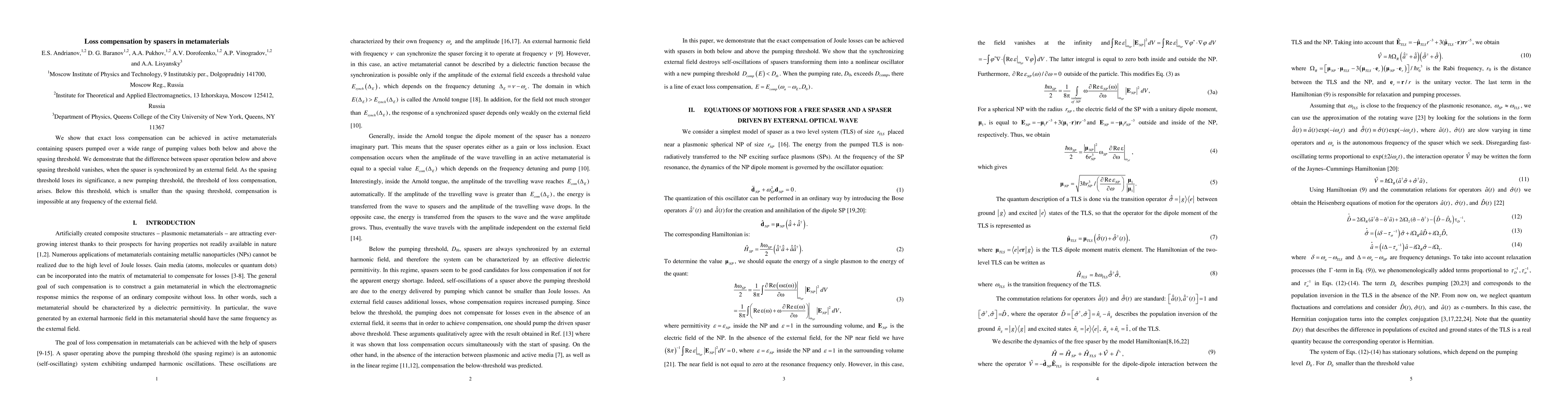 Researchers achieved exact loss compensation in active metamaterials using spasers with external field synchronization, eliminating the significance of the spasing threshold.
