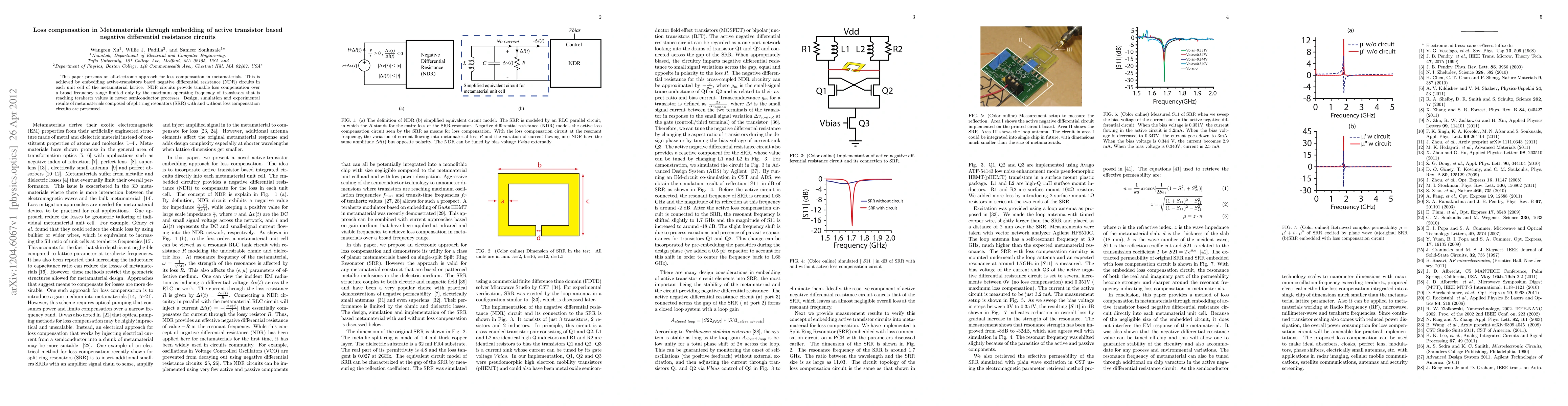 This paper presents an all-electronic approach for loss compensation in metamaterials. This is achieved by embedding active-transistors based negative differential resistance (NDR) circuits in each unit cell of the metamaterial lattice. NDR circuits provide tunable loss compensation over a broad frequency range limited only by the maximum operating frequency of transistors that is reaching terahertz values in newer semiconductor processes. Design, simulation and experimental results of metamaterials composed of split ring resonators (SRR) with and without loss compensation circuits are presented.