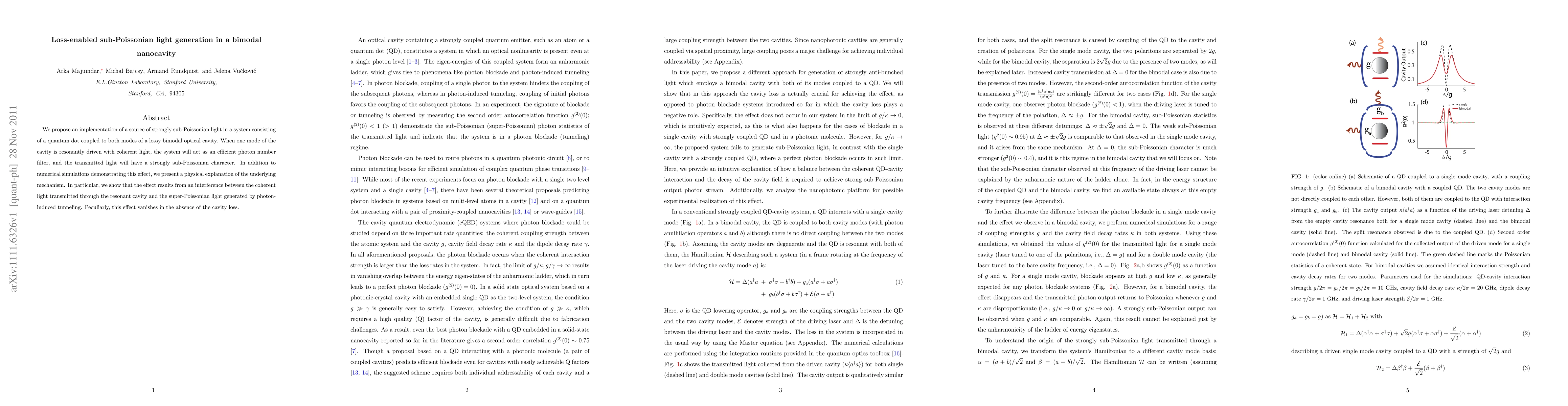 This paper proposes a method for generating strongly sub-Poissonian light using a quantum dot coupled to both modes of a lossy bimodal optical cavity. The coherent driving of one cavity mode results in photon number filtering and sub-Poissonian light transmission, explained by interference between transmitted coherent light and photon-induced tunneling.