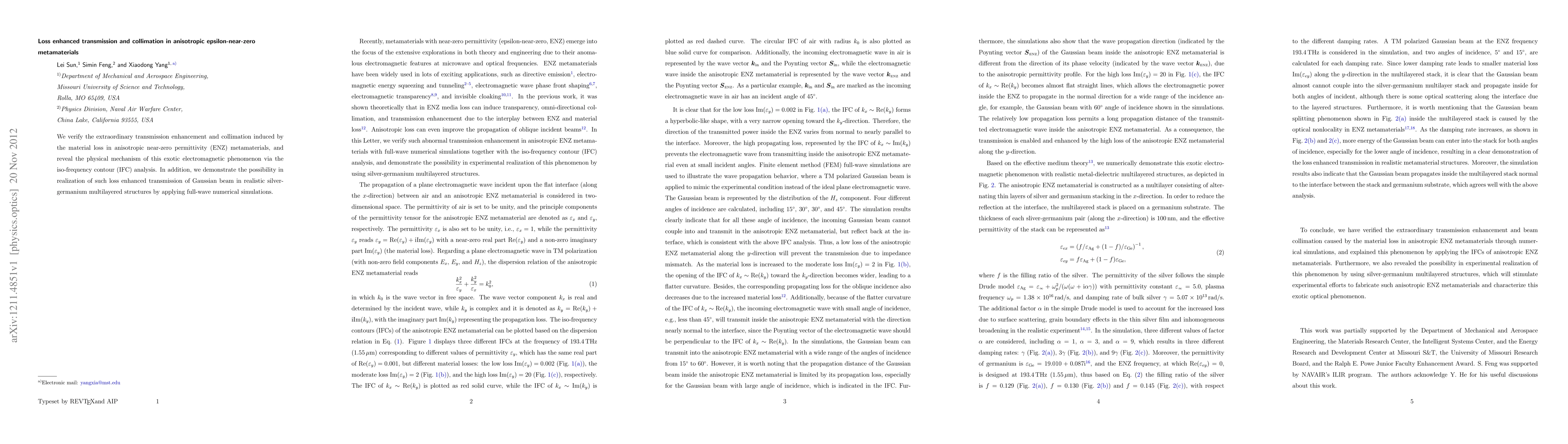 This paper investigates the enhanced transmission and collimation effects in anisotropic epsilon-near-zero (ENZ) metamaterials due to material loss, explaining the phenomenon through iso-frequency contour analysis and demonstrating the practical application in silver-germanium multilayer structures using numerical simulations.