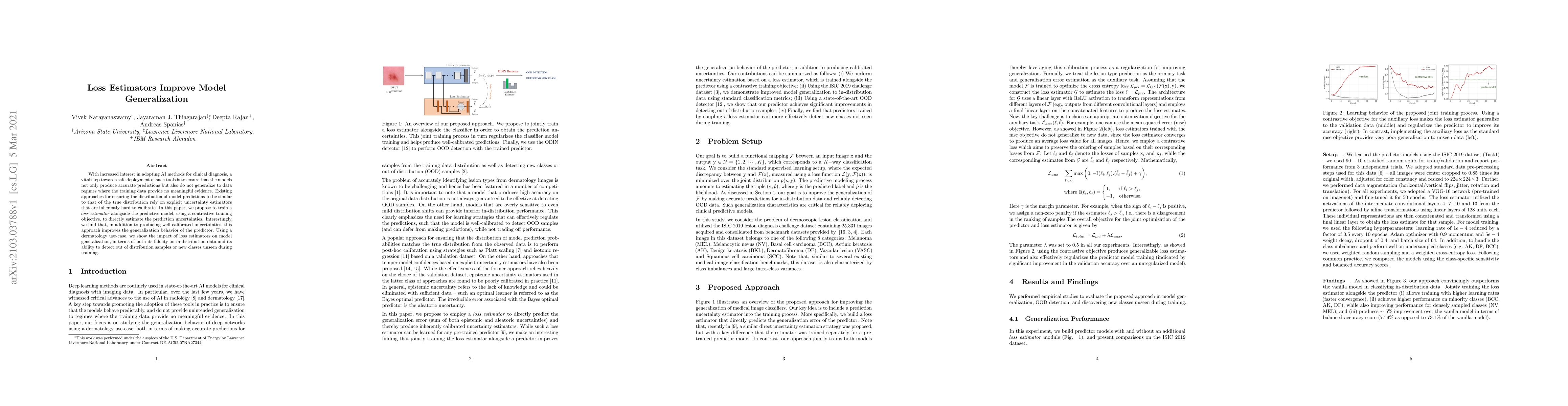 With increased interest in adopting AI methods for clinical diagnosis, a vital step towards safe deployment of such tools is to ensure that the models not only produce accurate predictions but also do not generalize to data regimes where the training data provide no meaningful evidence. Existing approaches for ensuring the distribution of model predictions to be similar to that of the true distribution rely on explicit uncertainty estimators that are inherently hard to calibrate. In this paper, we propose to train a loss estimator alongside the predictive model, using a contrastive training objective, to directly estimate the prediction uncertainties. Interestingly, we find that, in addition to producing well-calibrated uncertainties, this approach improves the generalization behavior of the predictor. Using a dermatology use-case, we show the impact of loss estimators on model generalization, in terms of both its fidelity on in-distribution data and its ability to detect out of distribution samples or new classes unseen during training.