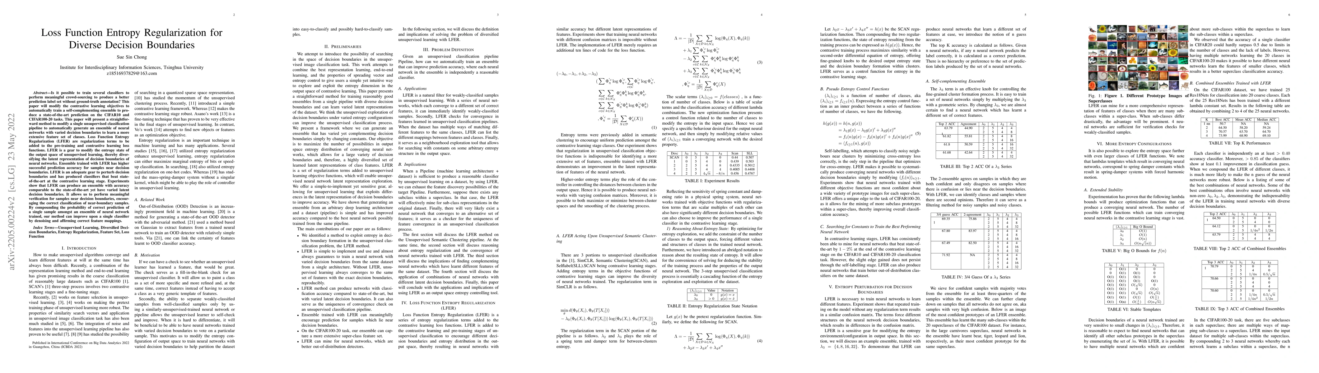 The paper introduces Loss Function Entropy Regularization (LFER), a method to train an ensemble of neural networks with diverse decision boundaries for unsupervised image classification. LFER is added to contrastive learning and pre-training loss functions to encourage different decision boundaries and entropy distribution in the output space.