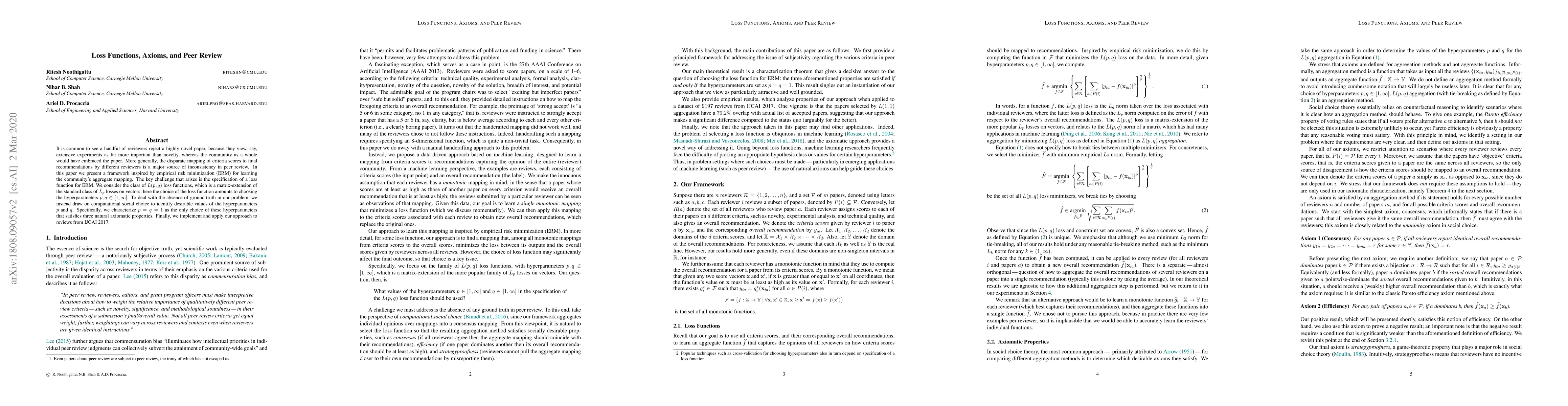 It is common to see a handful of reviewers reject a highly novel paper, because they view, say, extensive experiments as far more important than novelty, whereas the community as a whole would have embraced the paper. More generally, the disparate mapping of criteria scores to final recommendations by different reviewers is a major source of inconsistency in peer review. In this paper we present a framework inspired by empirical risk minimization (ERM) for learning the community's aggregate mapping. The key challenge that arises is the specification of a loss function for ERM. We consider the class of $L(p,q)$ loss functions, which is a matrix-extension of the standard class of $L_p$ losses on vectors; here the choice of the loss function amounts to choosing the hyperparameters $p, q \in [1,\infty]$. To deal with the absence of ground truth in our problem, we instead draw on computational social choice to identify desirable values of the hyperparameters $p$ and $q$. Specifically, we characterize $p=q=1$ as the only choice of these hyperparameters that satisfies three natural axiomatic properties. Finally, we implement and apply our approach to reviews from IJCAI 2017.