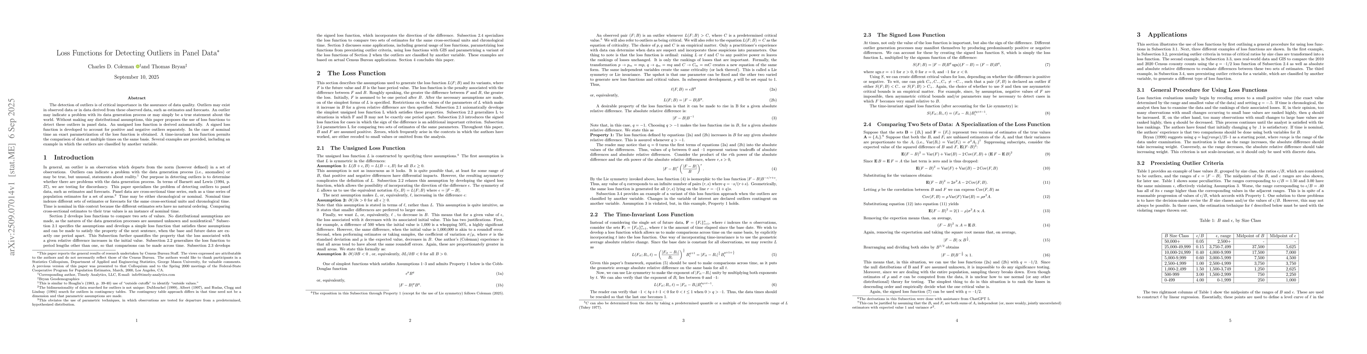 The detection of outliers is of critical importance in the assurance of data quality. Outliers may exist in observed data or in data derived from these observed data, such as estimates and forecasts. An outlier may indicate a problem with its data generation process or may simply be a true statement about the world. Without making any distributional assumptions, this paper proposes the use of loss functions to detect these outliers in panel data. An unsigned loss function is derived axiomatically. A signed loss function is developed to account for positive and negative outliers separately. In the case of nominal time an exact parametrization of the loss function is obtained. A time-invariant loss function permits the comparison of data at multiple times on the same basis. Several examples are provided, including an example in which the outliers are classified by another variable.