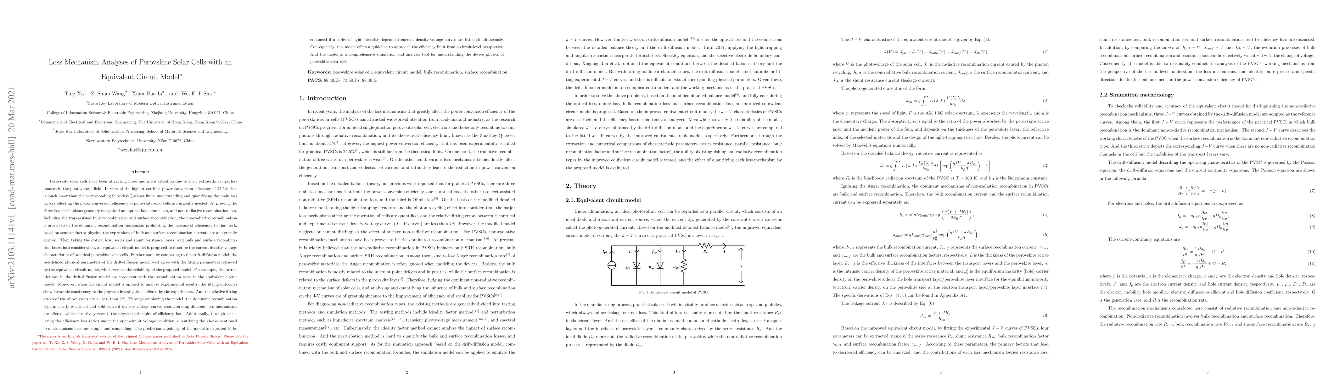 This paper proposes an equivalent circuit model to analyze the loss mechanisms in perovskite solar cells, deriving expressions for recombination and resistance losses, and comparing it to a drift-diffusion model. The model effectively identifies dominant recombination types and quantifies efficiency losses, providing a comprehensive tool for understanding device physics.