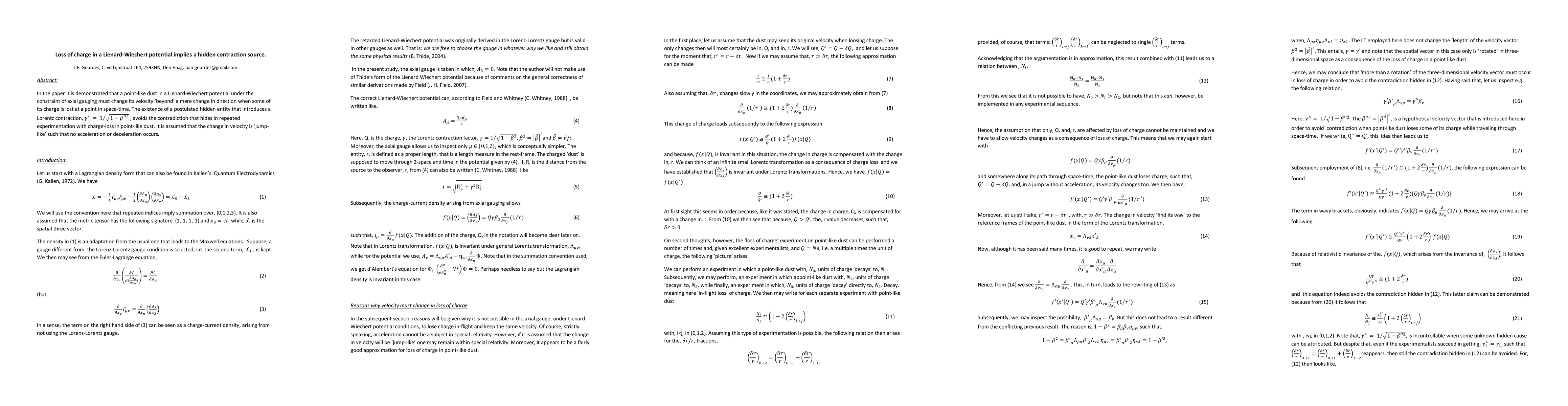 In the paper it is demonstrated that a point-like dust in a Lienard-Wiechert potential under the constraint of axial gauging must change its velocity 'beyond' a mere change in direction when a fraction of charge is lost at a point in space-time. The existence of a postulated hidden entity that introduces a Lorentz contraction avoids a concealed contradiction in repeated experimentation with charge loss in point-like dust.