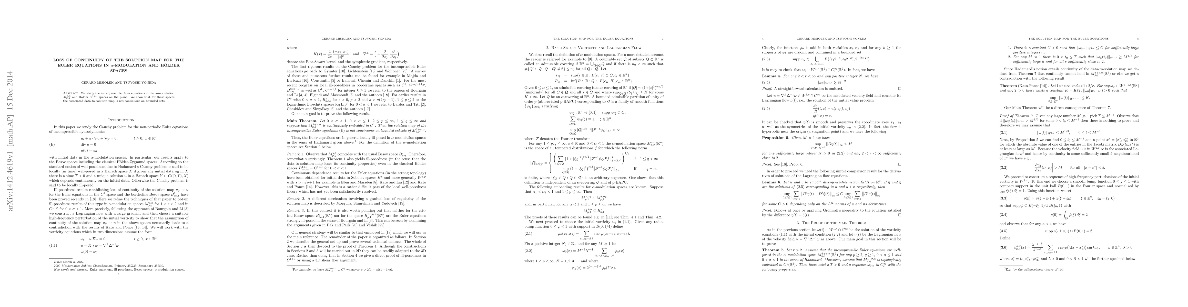 We study the incompressible Euler equations in the $\alpha$-modulation $M^{s,\alpha}_{p,q}$ and H\"older $C^{1+\sigma}$ spaces on the plane. We show that for these spaces the associated data-to-solution map is not continuous on bounded sets.