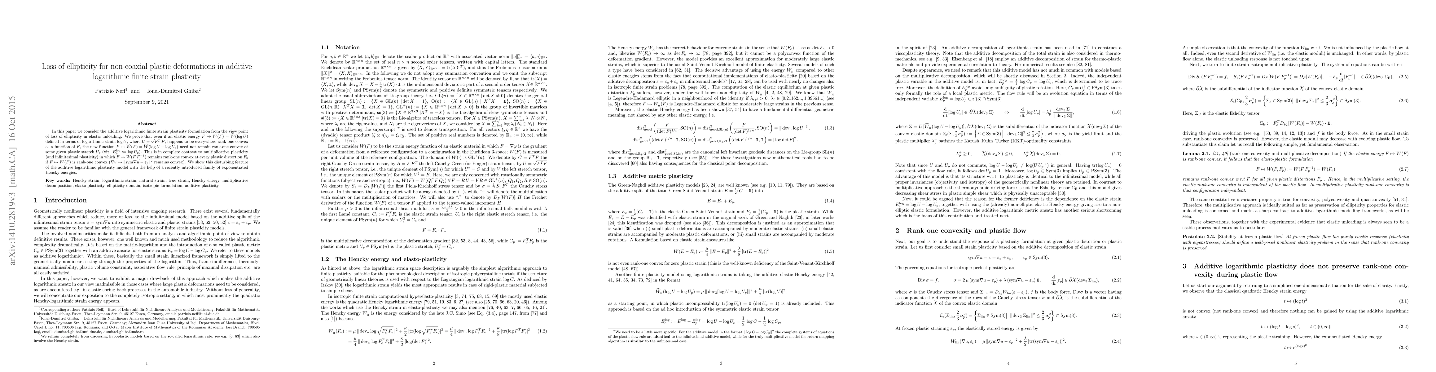 This paper investigates the loss of ellipticity in additive logarithmic finite strain plasticity during elastic unloading, proving that rank-one convexity may not be preserved under certain plastic deformations, contrasting with the behavior in multiplicative plasticity. The study uses a family of exponentiated Hencky energies to illustrate this phenomenon.