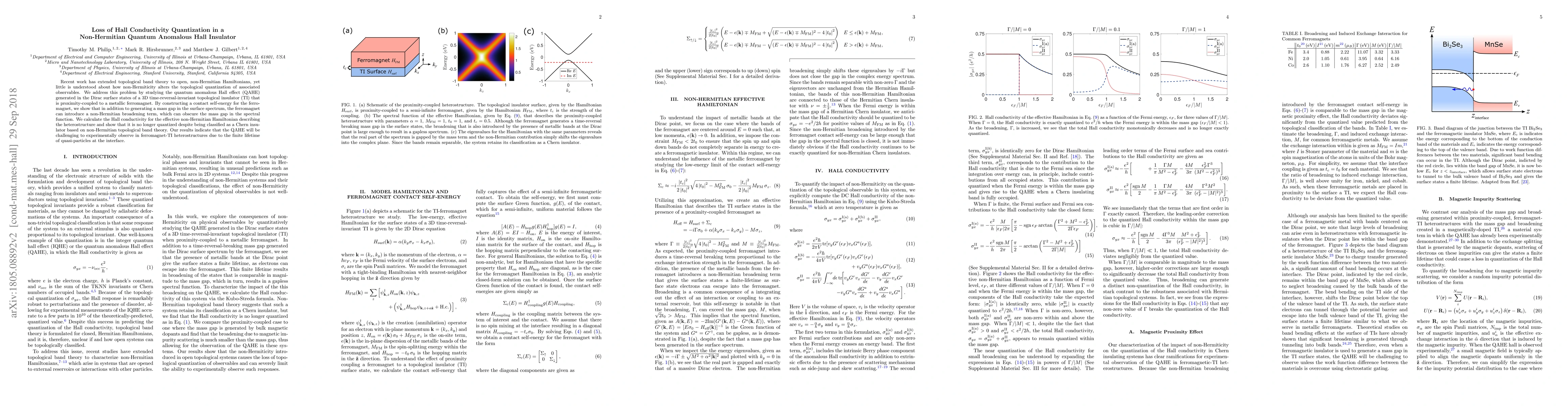 The study analytically derives a contact self-energy characterizing the effect of proximity-coupling a metallic ferromagnet to a TI surface state, calculating the Hall conductivity for the effective non-Hermitian Hamiltonian describing the heterostructure.