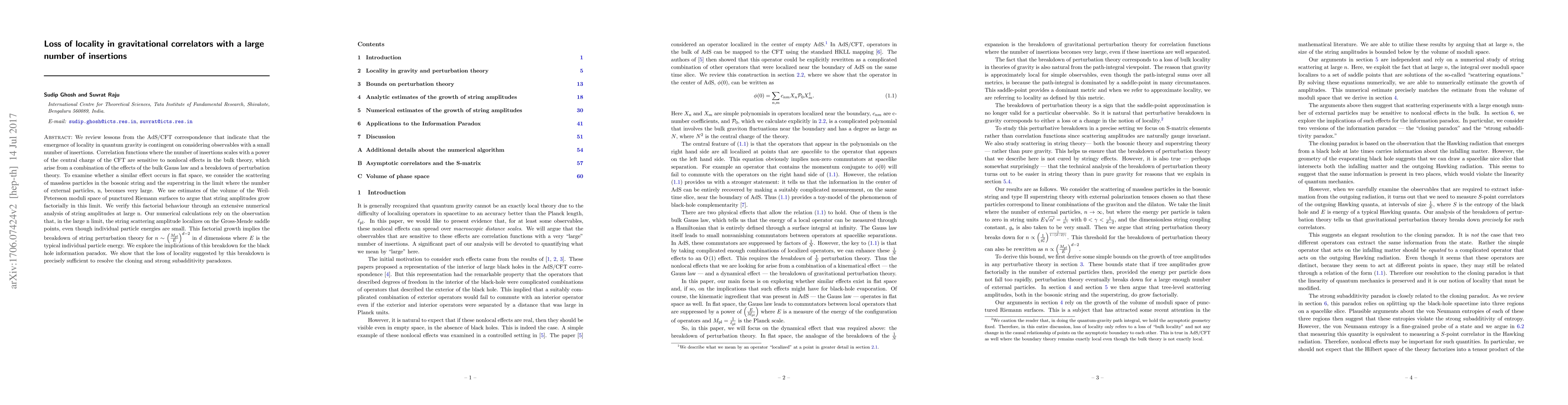 We review lessons from the AdS/CFT correspondence that indicate that the emergence of locality in quantum gravity is contingent on considering observables with a small number of insertions. Correlation functions where the number of insertions scales with a power of the central charge of the CFT are sensitive to nonlocal effects in the bulk theory, which arise from a combination of the effects of the bulk Gauss law and a breakdown of perturbation theory. To examine whether a similar effect occurs in flat space, we consider the scattering of massless particles in the bosonic string and the superstring in the limit where the number of external particles, n, becomes very large. We use estimates of the volume of the Weil-Petersson moduli space of punctured Riemann surfaces to argue that string amplitudes grow factorially in this limit. We verify this factorial behaviour through an extensive numerical analysis of string amplitudes at large n. Our numerical calculations rely on the observation that, in the large n limit, the string scattering amplitude localizes on the Gross-Mende saddle points, even though individual particle energies are small. This factorial growth implies the breakdown of string perturbation theory for $n \sim (M_{pl}/E)^{d-2}$ in d dimensions where E is the typical individual particle energy. We explore the implications of this breakdown for the black hole information paradox. We show that the loss of locality suggested by this breakdown is precisely sufficient to resolve the cloning and strong subadditivity paradoxes.