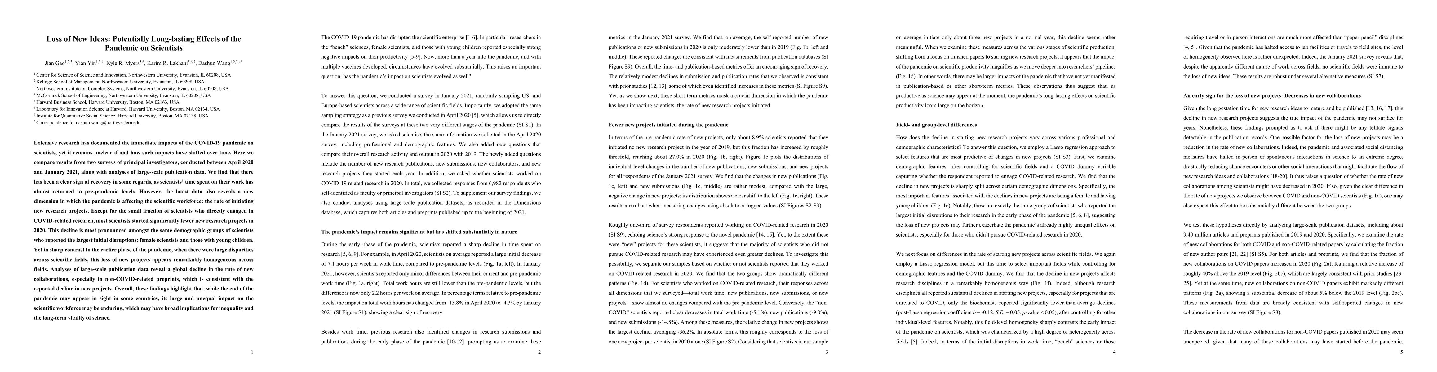 Extensive research has documented the immediate impacts of the COVID-19 pandemic on scientists, yet it remains unclear if and how such impacts have shifted over time. Here we compare results from two surveys of principal investigators, conducted between April 2020 and January 2021, along with analyses of large-scale publication data. We find that there has been a clear sign of recovery in some regards, as scientists' time spent on their work has almost returned to pre-pandemic levels. However, the latest data also reveals a new dimension in which the pandemic is affecting the scientific workforce: the rate of initiating new research projects. Except for the small fraction of scientists who directly engaged in COVID-related research, most scientists started significantly fewer new research projects in 2020. This decline is most pronounced amongst the same demographic groups of scientists who reported the largest initial disruptions: female scientists and those with young children. Yet in sharp contrast to the earlier phase of the pandemic, when there were large disparities across scientific fields, this loss of new projects appears remarkably homogeneous across fields. Analyses of large-scale publication data reveal a global decline in the rate of new collaborations, especially in non-COVID-related preprints, which is consistent with the reported decline in new projects. Overall, these findings highlight that, while the end of the pandemic may appear in sight in some countries, its large and unequal impact on the scientific workforce may be enduring, which may have broad implications for inequality and the long-term vitality of science.