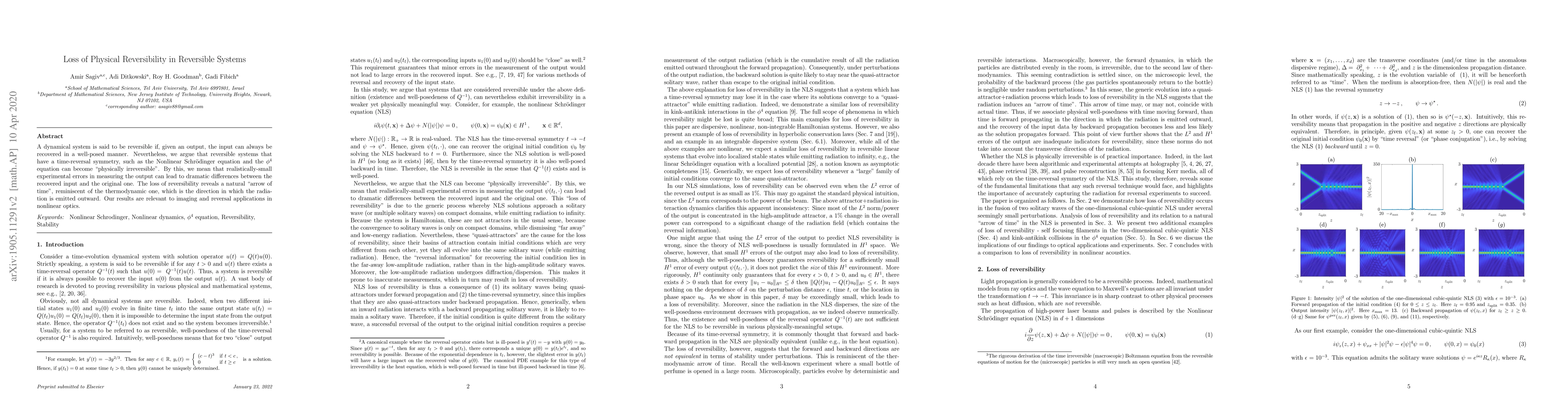 A dynamical system is said to be reversible if, given an output, the input can always be recovered in a well-posed manner. Nevertheless, we argue that reversible systems that have a time-reversal symmetry, such as the Nonlinear Schr{\"o}dinger equation and the $\phi ^4$ equation can become "physically irreversible". By this, we mean that realistically-small experimental errors in measuring the output can lead to dramatic differences between the recovered input and the original one. The loss of reversibility reveals a natural "arrow of time", reminiscent of the thermodynamic one, which is the direction in which the radiation is emitted outward. Our results are relevant to imaging and reversal applications in nonlinear optics.