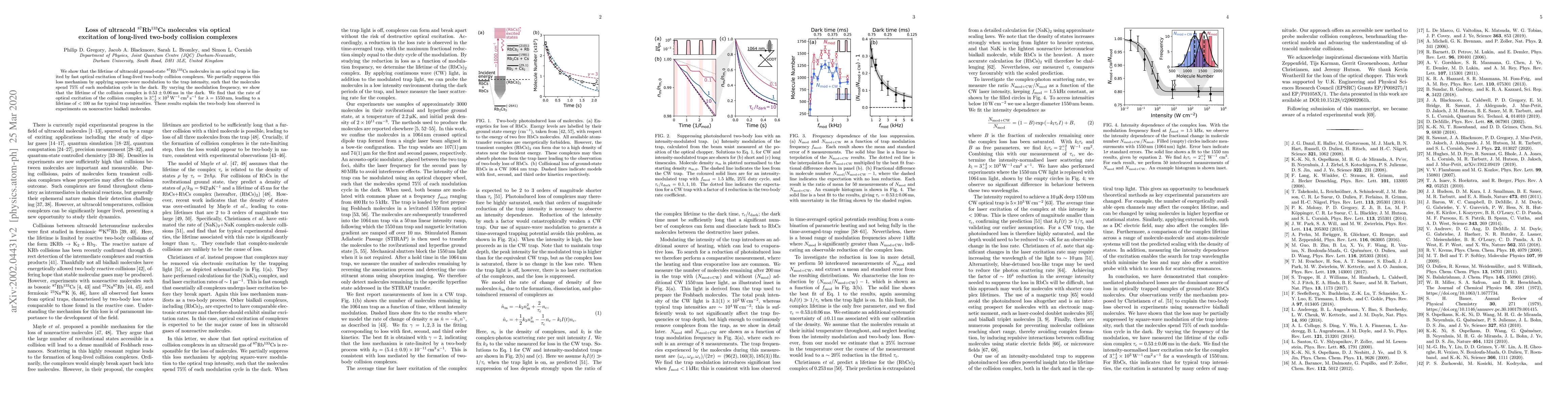 This paper investigates the loss mechanism of ultracold RbCs molecules in an optical trap due to optical excitation of long-lived two-body collision complexes, finding a lifetime of 0.53 ms in the dark. By modulating the trap intensity, the loss is partially suppressed, explaining observed two-body loss in bialkali experiments.