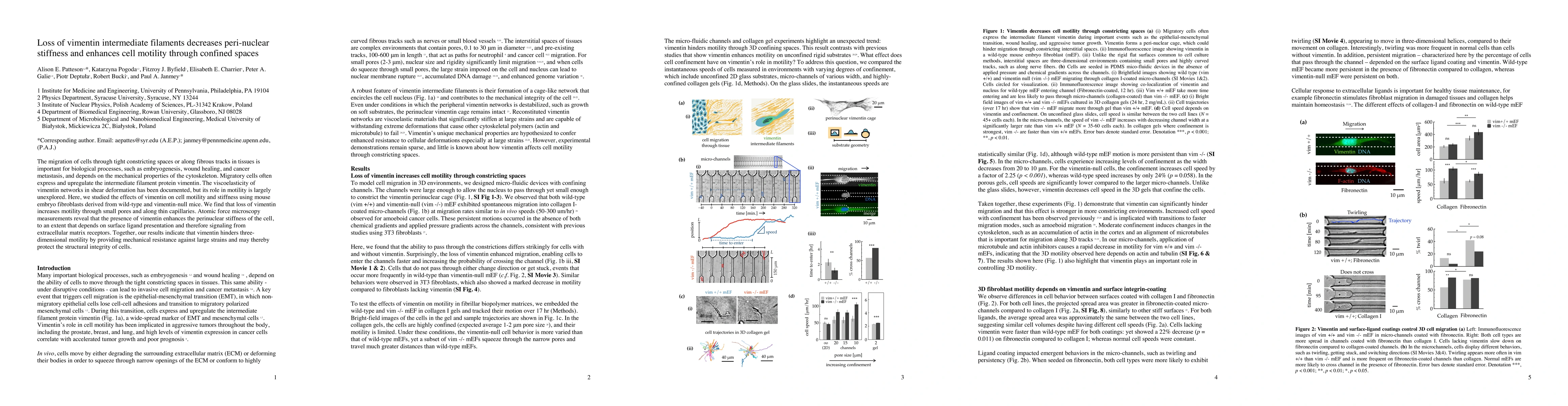 This study reveals that the absence of vimentin intermediate filaments enhances cell motility through confined spaces by decreasing peri-nuclear stiffness, suggesting vimentin provides mechanical resistance that impedes three-dimensional movement.