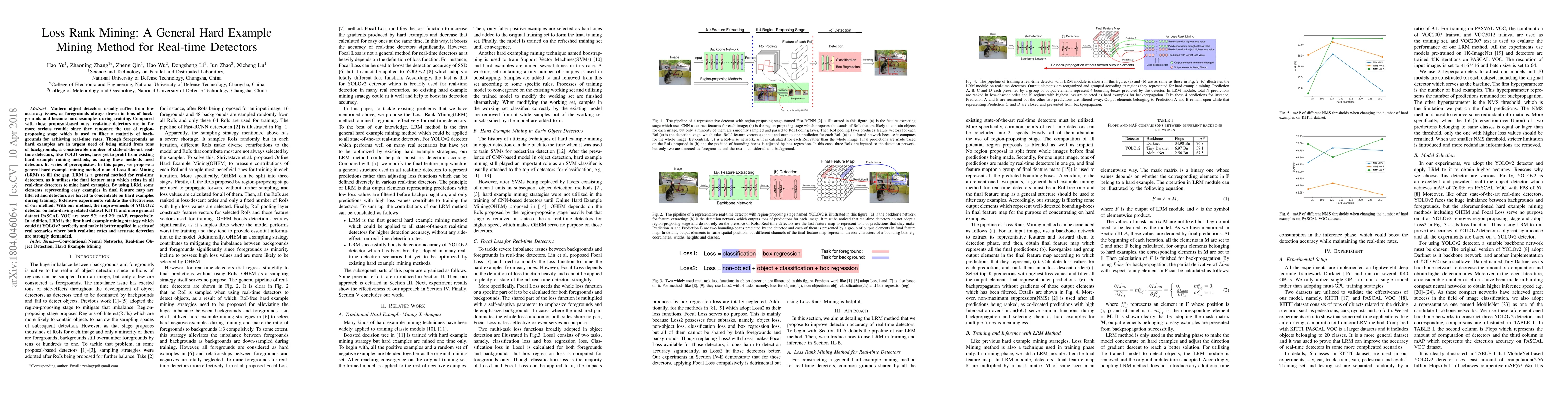 Modern object detectors usually suffer from low accuracy issues, as foregrounds always drown in tons of backgrounds and become hard examples during training. Compared with those proposal-based ones, real-time detectors are in far more serious trouble since they renounce the use of region-proposing stage which is used to filter a majority of backgrounds for achieving real-time rates. Though foregrounds as hard examples are in urgent need of being mined from tons of backgrounds, a considerable number of state-of-the-art real-time detectors, like YOLO series, have yet to profit from existing hard example mining methods, as using these methods need detectors fit series of prerequisites. In this paper, we propose a general hard example mining method named Loss Rank Mining (LRM) to fill the gap. LRM is a general method for real-time detectors, as it utilizes the final feature map which exists in all real-time detectors to mine hard examples. By using LRM, some elements representing easy examples in final feature map are filtered and detectors are forced to concentrate on hard examples during training. Extensive experiments validate the effectiveness of our method. With our method, the improvements of YOLOv2 detector on auto-driving related dataset KITTI and more general dataset PASCAL VOC are over 5% and 2% mAP, respectively. In addition, LRM is the first hard example mining strategy which could fit YOLOv2 perfectly and make it better applied in series of real scenarios where both real-time rates and accurate detection are strongly demanded.