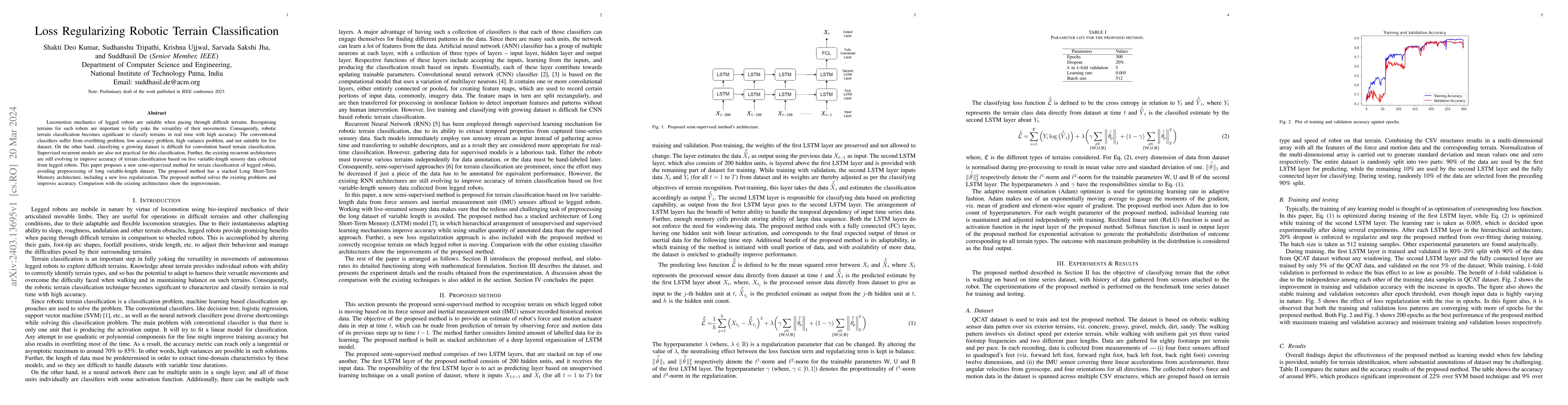 Locomotion mechanics of legged robots are suitable when pacing through difficult terrains. Recognising terrains for such robots are important to fully yoke the versatility of their movements. Consequently, robotic terrain classification becomes significant to classify terrains in real time with high accuracy. The conventional classifiers suffer from overfitting problem, low accuracy problem, high variance problem, and not suitable for live dataset. On the other hand, classifying a growing dataset is difficult for convolution based terrain classification. Supervised recurrent models are also not practical for this classification. Further, the existing recurrent architectures are still evolving to improve accuracy of terrain classification based on live variable-length sensory data collected from legged robots. This paper proposes a new semi-supervised method for terrain classification of legged robots, avoiding preprocessing of long variable-length dataset. The proposed method has a stacked Long Short-Term Memory architecture, including a new loss regularization. The proposed method solves the existing problems and improves accuracy. Comparison with the existing architectures show the improvements.
