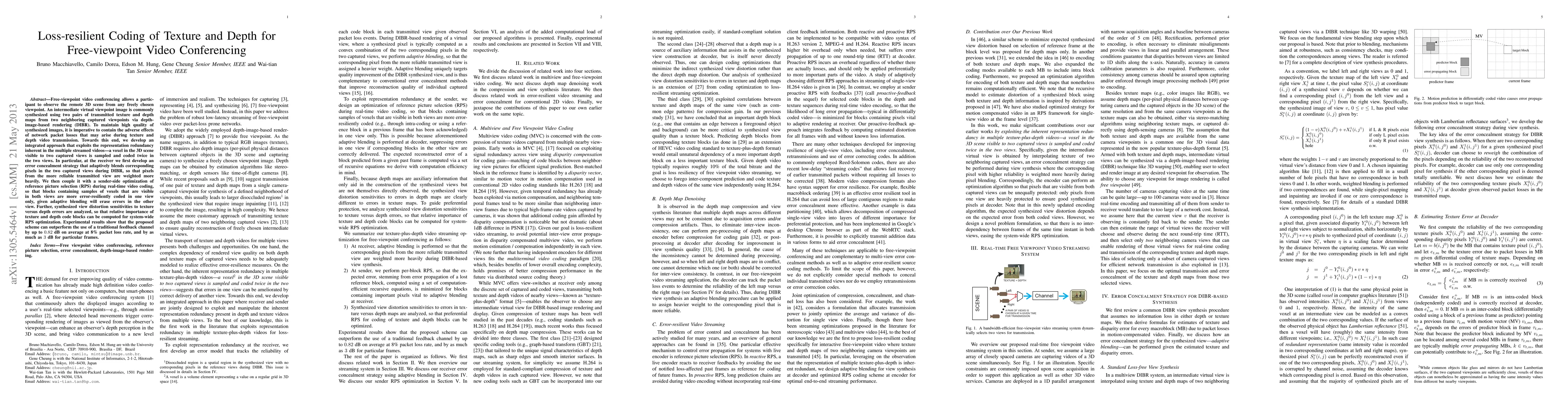 Free-viewpoint video conferencing allows a participant to observe the remote 3D scene from any freely chosen viewpoint. An intermediate virtual viewpoint image is commonly synthesized using two pairs of transmitted texture and depth maps from two neighboring captured viewpoints via depth-image-based rendering (DIBR). To maintain high quality of synthesized images, it is imperative to contain the adverse effects of network packet losses that may arise during texture and depth video transmission. Towards this end, we develop an integrated approach that exploits the representation redundancy inherent in the multiple streamed videos a voxel in the 3D scene visible to two captured views is sampled and coded twice in the two views. In particular, at the receiver we first develop an error concealment strategy that adaptively blends corresponding pixels in the two captured views during DIBR, so that pixels from the more reliable transmitted view are weighted more heavily. We then couple it with a sender-side optimization of reference picture selection (RPS) during real-time video coding, so that blocks containing samples of voxels that are visible in both views are more error-resiliently coded in one view only, given adaptive blending will erase errors in the other view. Further, synthesized view distortion sensitivities to texture versus depth errors are analyzed, so that relative importance of texture and depth code blocks can be computed for system-wide RPS optimization. Experimental results show that the proposed scheme can outperform the use of a traditional feedback channel by up to 0.82 dB on average at 8% packet loss rate, and by as much as 3 dB for particular frames.