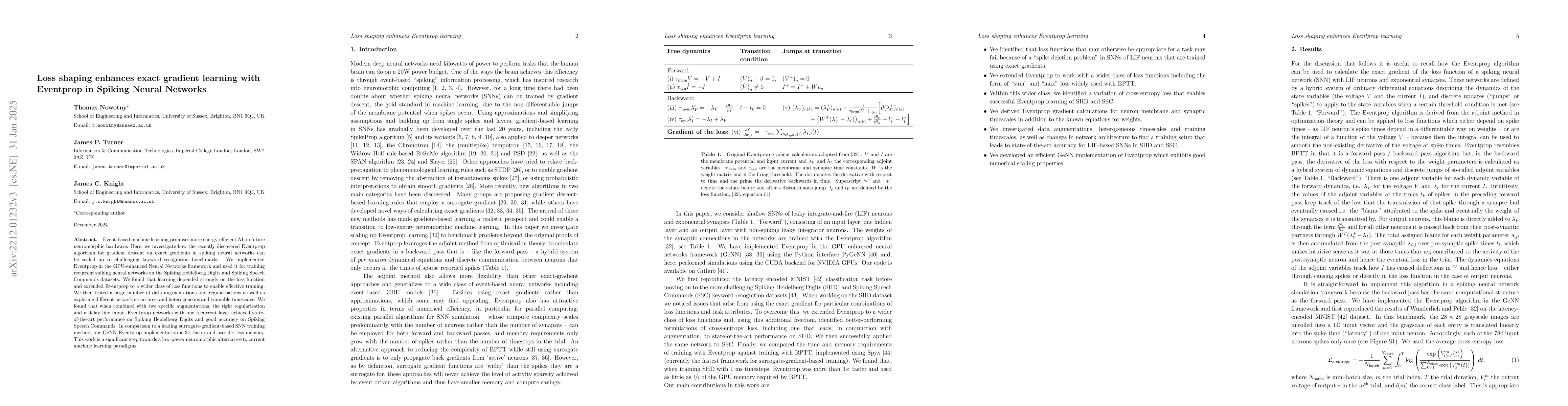 This paper explores enhancing Eventprop for gradient learning in spiking neural networks, finding that loss shaping is crucial for effective training. When combined with suitable machine learning techniques, Eventprop networks achieved top performance on Spiking Heidelberg Digits and competitive results on Spiking Speech Commands, advancing low-power neuromorphic AI.