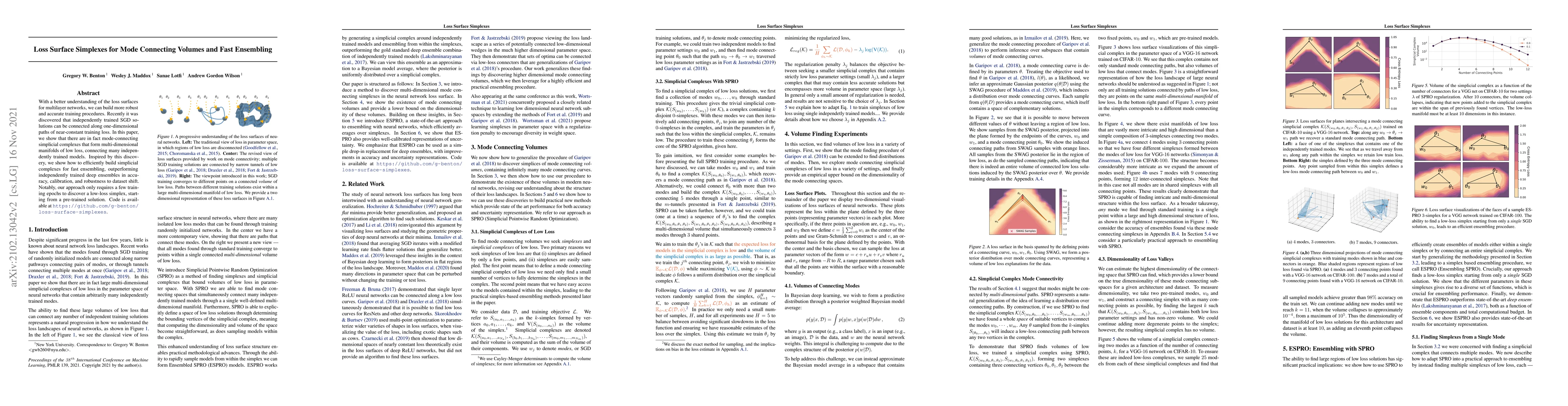 With a better understanding of the loss surfaces for multilayer networks, we can build more robust and accurate training procedures. Recently it was discovered that independently trained SGD solutions can be connected along one-dimensional paths of near-constant training loss. In this paper, we show that there are mode-connecting simplicial complexes that form multi-dimensional manifolds of low loss, connecting many independently trained models. Inspired by this discovery, we show how to efficiently build simplicial complexes for fast ensembling, outperforming independently trained deep ensembles in accuracy, calibration, and robustness to dataset shift. Notably, our approach only requires a few training epochs to discover a low-loss simplex, starting from a pre-trained solution. Code is available at https://github.com/g-benton/loss-surface-simplexes.
