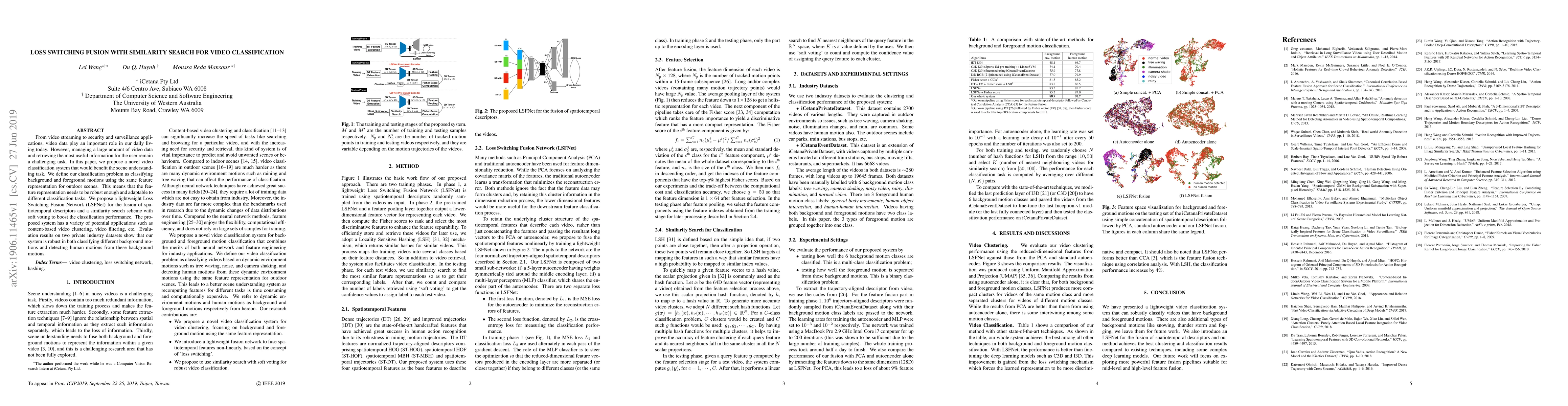This paper proposes a novel video classification system using a Loss Switching Fusion Network (LSFNet) that fuses spatiotemporal descriptors and employs a similarity search scheme with soft voting for robust scene understanding. The system effectively classifies background and foreground motions, demonstrating strong performance on private industry datasets.