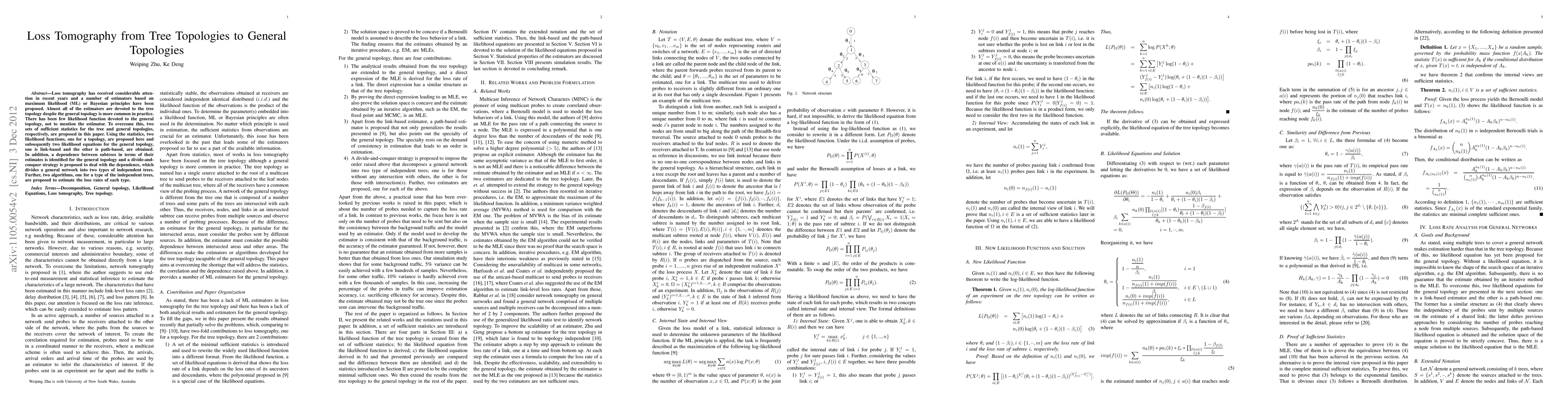 Loss tomography has received considerable attention in recent years and a number of estimators based on maximum likelihood (ML) or Bayesian principles have been proposed. Almost all of the estimators are devoted to the tree topology despite the general topology is more common in practice. There has been few likelihood function devoted to the general topology, not to mention the estimator. To overcome this, two sets of sufficient statistics for the tree and general topologies, respectively, are proposed in this paper. Using the statistics, two likelihood functions, one for a topology, are proposed here and subsequently two likelihood equations for the general topology, one is link-based and the other is path-based, are obtained. In addition, a dependence between subtrees in terms of their estimates is identified for the general topology and a divide-and-conquer strategy is proposed to deal with the dependence, which divides a general network into two types of independent trees. Further, two algorithms, one for a type of the independent trees, are proposed to estimate the loss rates of each type.