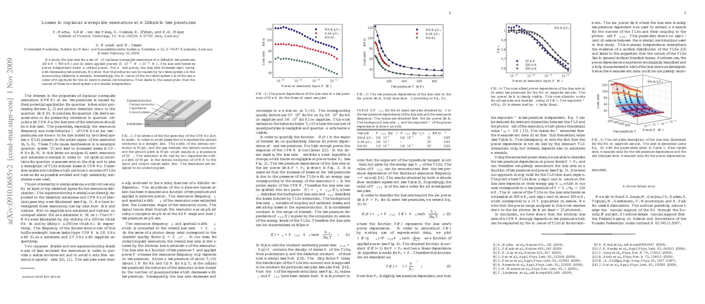 This paper investigates the loss rate in coplanar waveguide resonators at millikelvin temperatures, finding that below a critical power, the loss rate becomes independent of power. The study reveals a significant increase in loss with decreasing temperature, attributed to two-level systems in the dielectric materials, whose influence is material independent.