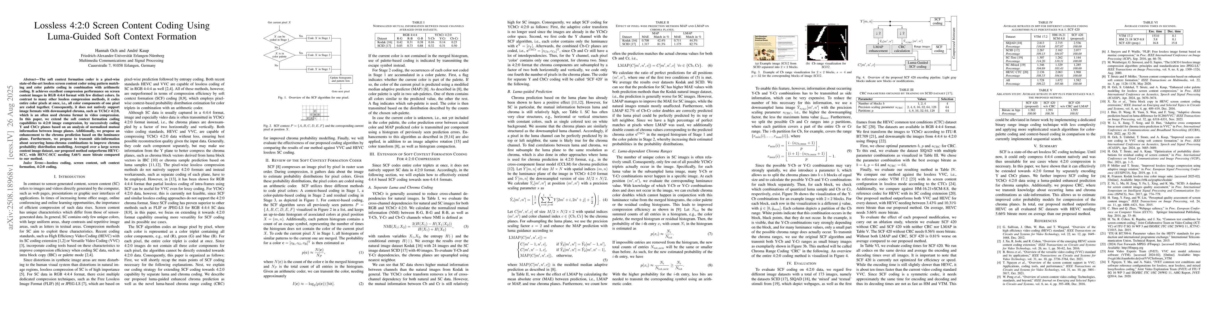 The soft context formation coder is a pixel-wise state-of-the-art lossless screen content coder using pattern matching and color palette coding in combination with arithmetic coding. It achieves excellent compression performance on screen content images in RGB 4:4:4 format with few distinct colors. In contrast to many other lossless compression methods, it codes entire color pixels at once, i.e., all color components of one pixel are coded together. Consequently, it does not natively support image formats with downsampled chroma, such as YCbCr 4:2:0, which is an often used chroma format in video compression. In this paper, we extend the soft context formation coding capabilities to 4:2:0 image compression, by successively coding Y and CbCr planes based on an analysis of normalized mutual information between image planes. Additionally, we propose an enhancement to the chroma prediction based on the luminance plane. Furthermore, we propose to transmit side-information about occurring luma-chroma combinations to improve chroma probability distribution modelling. Averaged over a large screen content image dataset, our proposed method outperforms HEVC-SCC, with HEVC-SCC needing 5.66% more bitrate compared to our method.