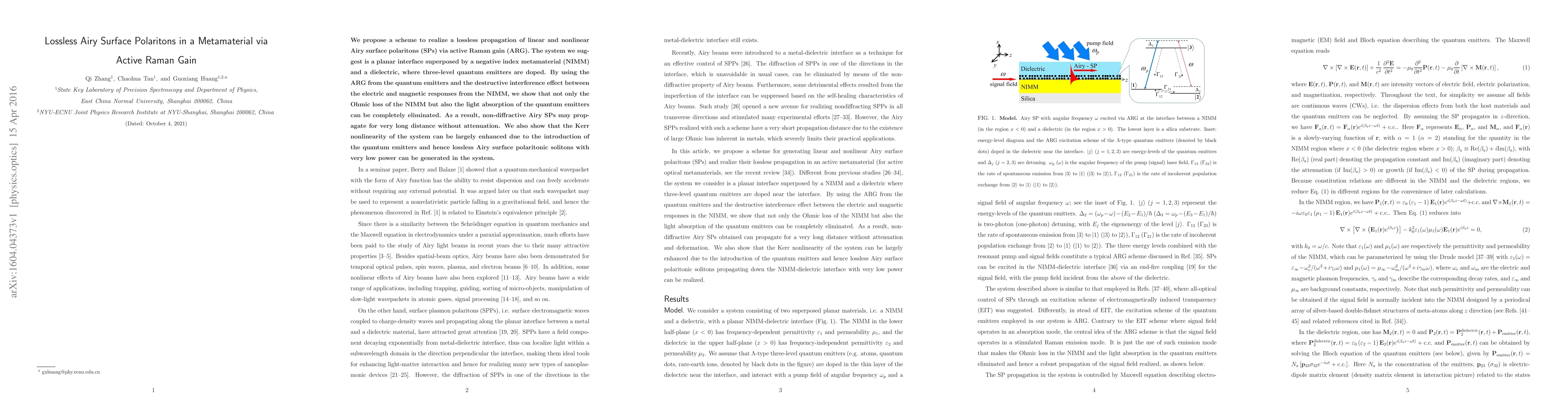 This paper proposes a method to achieve lossless propagation of Airy surface polaritons using active Raman gain in a negative index metamaterial interfaced with a dielectric, enhanced by three-level quantum emitters. The scheme eliminates both Ohmic loss and light absorption, enabling long-distance propagation of non-diffractive Airy surface polaritons.