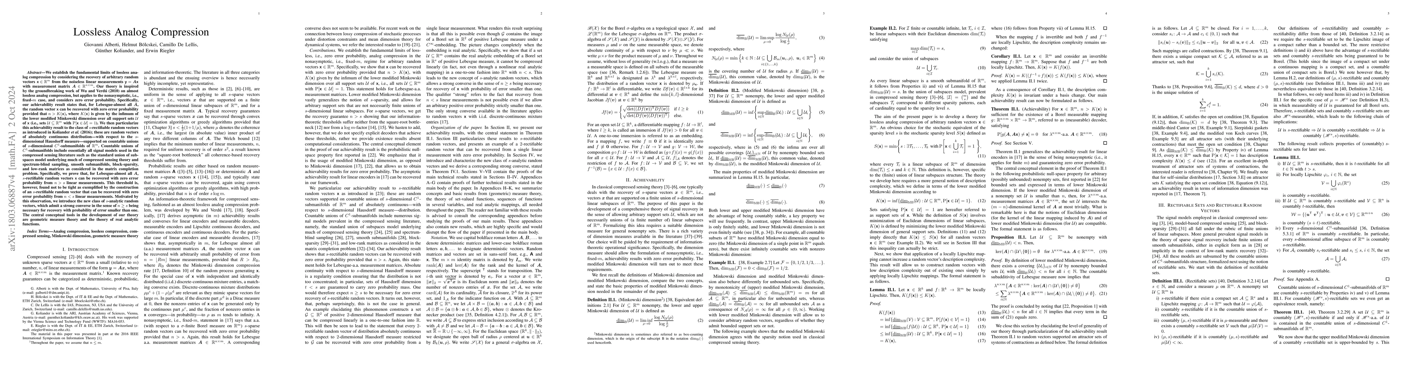 This paper establishes the fundamental limits of lossless analog compression for fixed-dimensional random vectors, proving that zero error recovery is possible with sufficient measurements. It introduces new classes of s-rectifiable and s-analytic random vectors, showing that while n>s measurements are sufficient for recovery, tighter thresholds may exist.