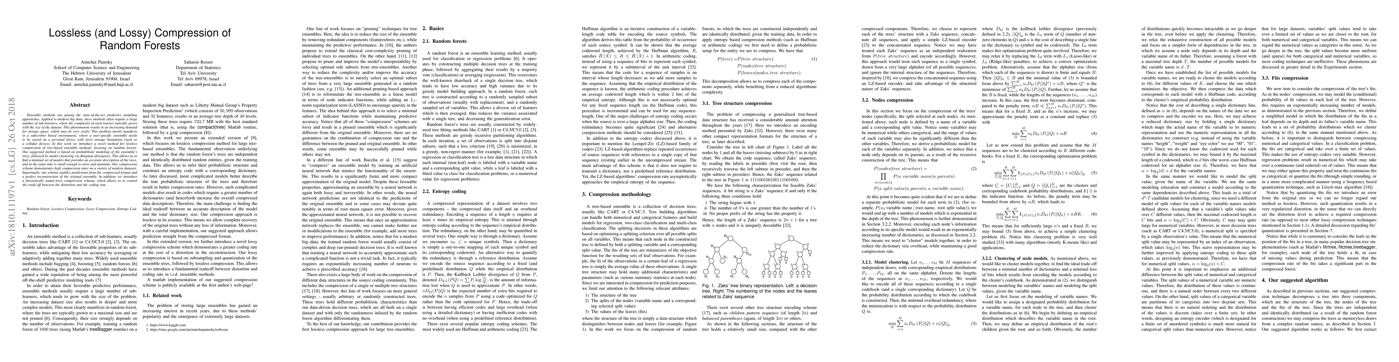 This paper introduces a novel method for compressing random forests using probabilistic modeling and clustering, achieving high compression rates while preserving accuracy. It also proposes a lossy compression scheme to control trade-off between distortion and coding rate.