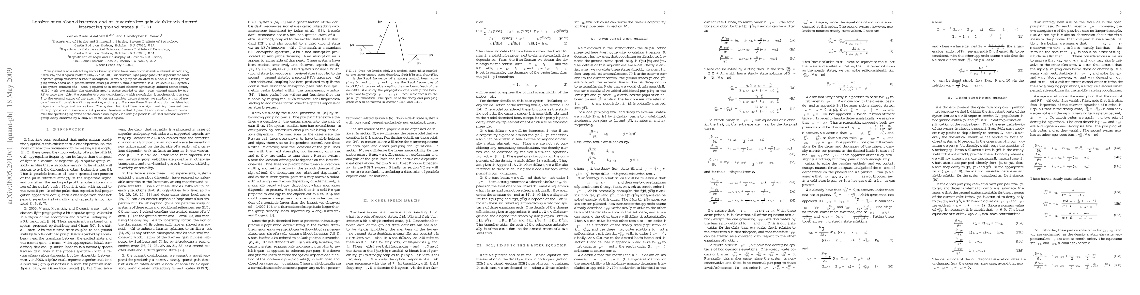 This paper proposes an atomic model based on dressed interacting ground states (DIGS) to achieve lossless anomalous dispersion and inversionless gain doublets, significantly improving group delay control compared to previous methods. The model utilizes a five-level system with electromagnetically induced transparency and additional metastable ground states, enabling tunable gain lines and superluminal propagation without absorption.