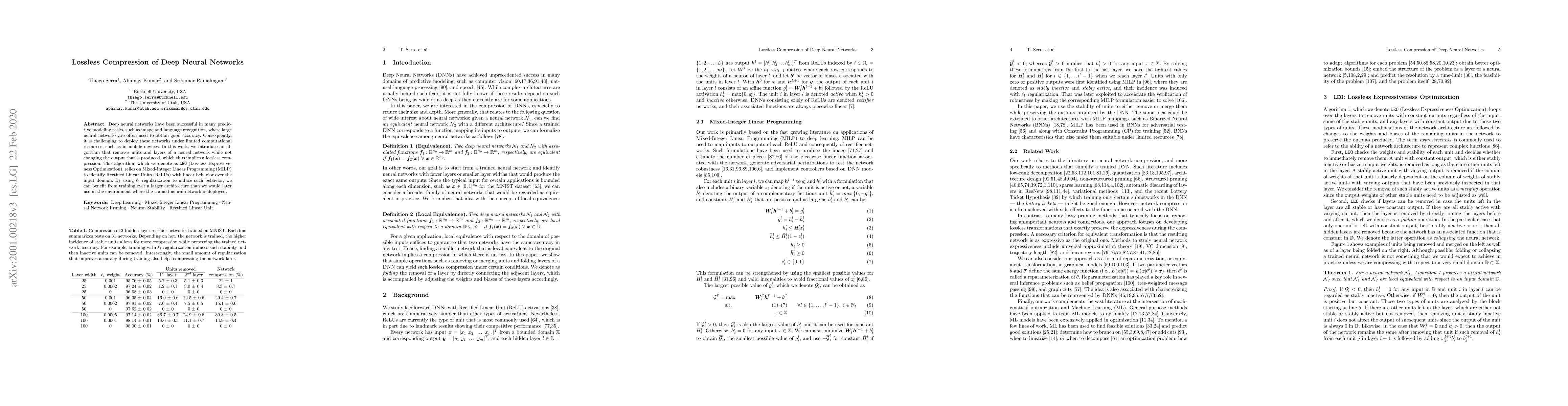 This paper proposes a lossless compression algorithm called LEO for deep neural networks, which removes units and layers without altering output. It uses Mixed-Integer Linear Programming to identify linear ReLUs and L1 regularization to optimize expressiveness, enabling deployment in resource-constrained environments.