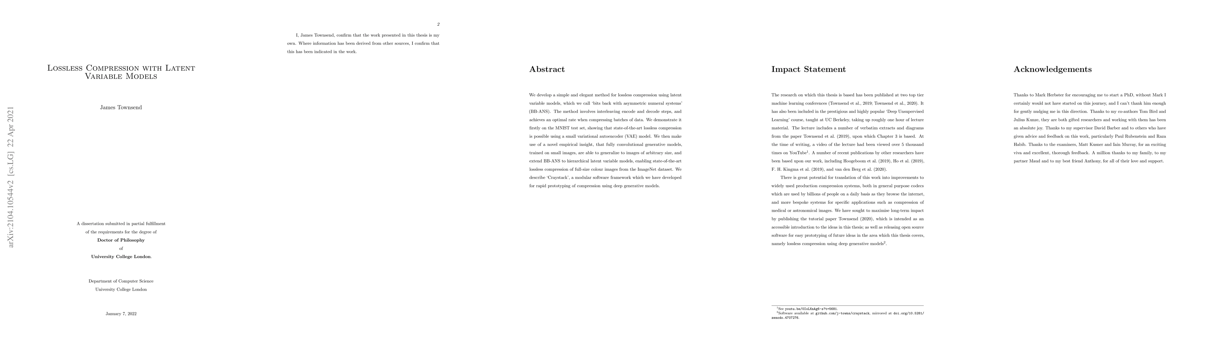 This paper introduces 'bits back with asymmetric numeral systems' (BB-ANS) for lossless compression using latent variable models, achieving optimal rates for batch data. It demonstrates the method on MNIST and extends it to full-size ImageNet images using hierarchical latent variable models, facilitated by the 'Craystack' software framework.
